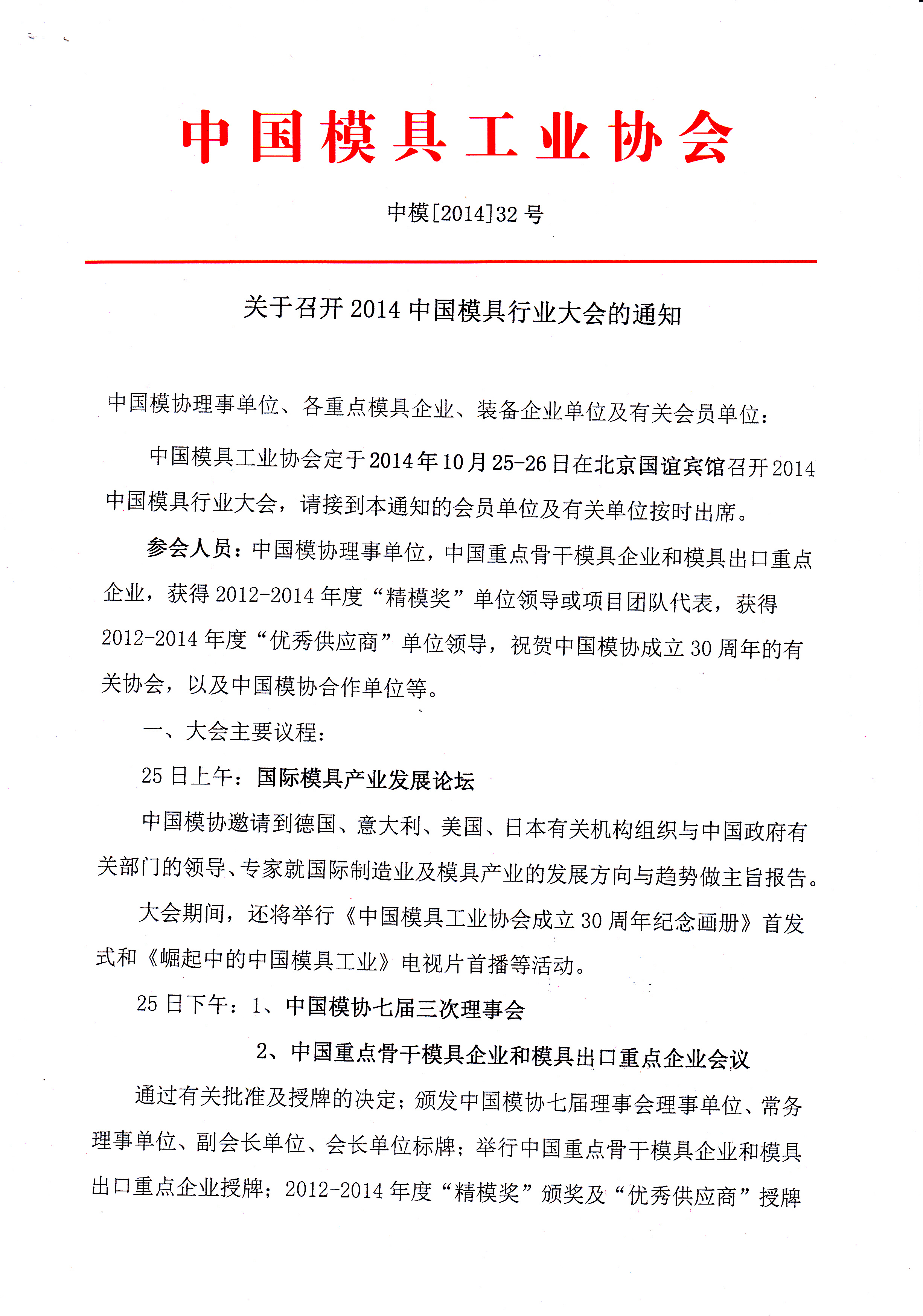 关于召开2014中国模具行业大会的通知