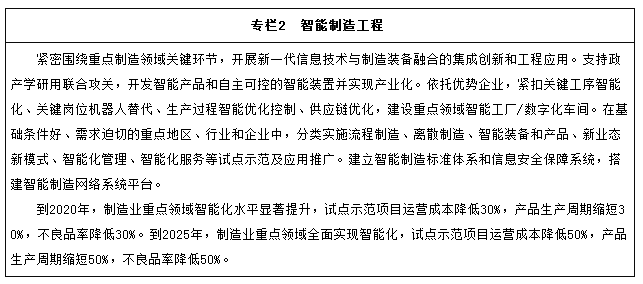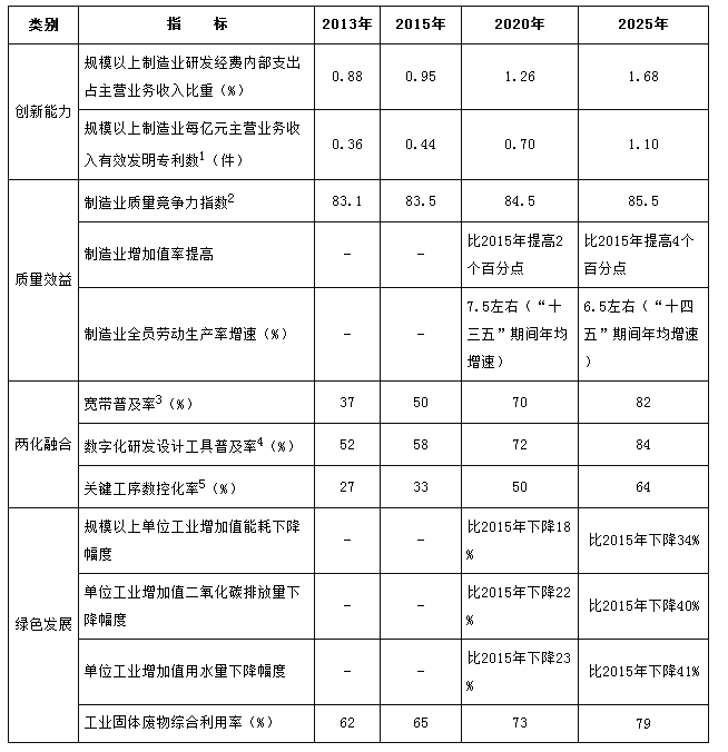 到2025年,制造业整体素质大幅提升,创新能力显著增强,全员劳动生产率明显提高,两化(工业化和信息化)融合迈上新台阶。重点行业单位工业增加值能耗、物耗及污染物排放达到世界先进水平。形成一批具有较强国际竞争力的跨国公司和产业集群,在全球产业分工和价值链中的地位明显提升。
