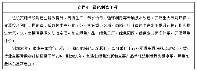 加大先进节能环保技术、工艺和装备的研发力度,加快制造业绿色改造升级;积极推行低碳化、循环化和集约化,提高制造业资源利用效率;强化产品全生命周期绿色管理,努力构建高效、清洁、低碳、循环的绿色制造体系。