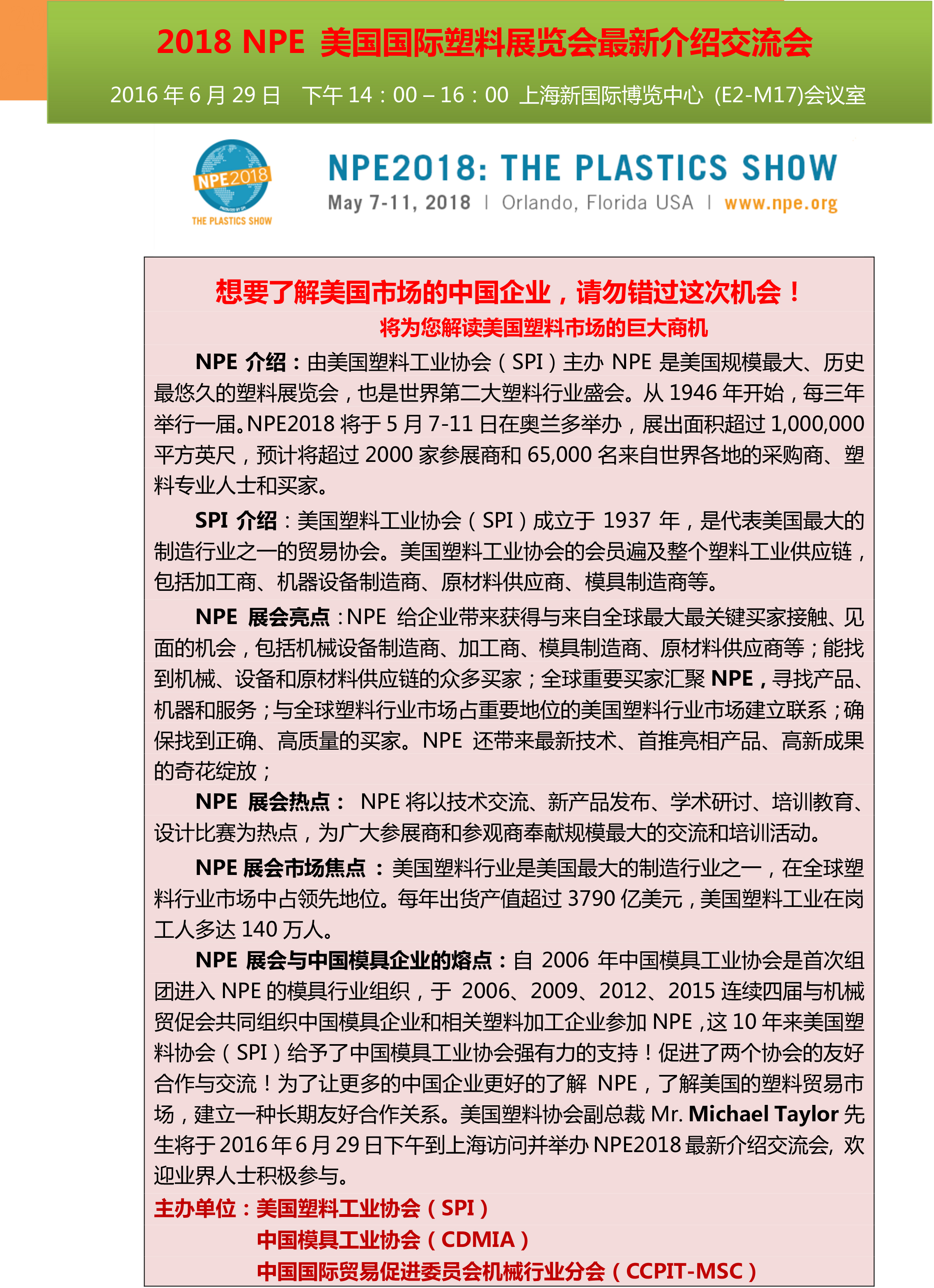 2018NPE 美国国际塑料展览会最新介绍交流会