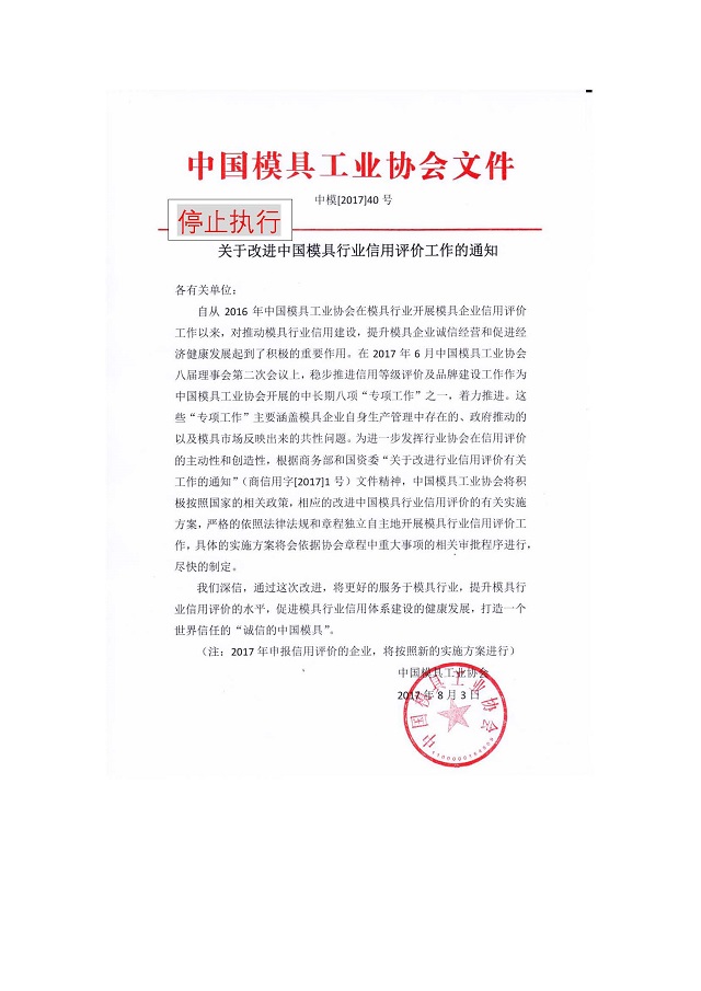 关于改进中国模具行业信用评价工作的通知