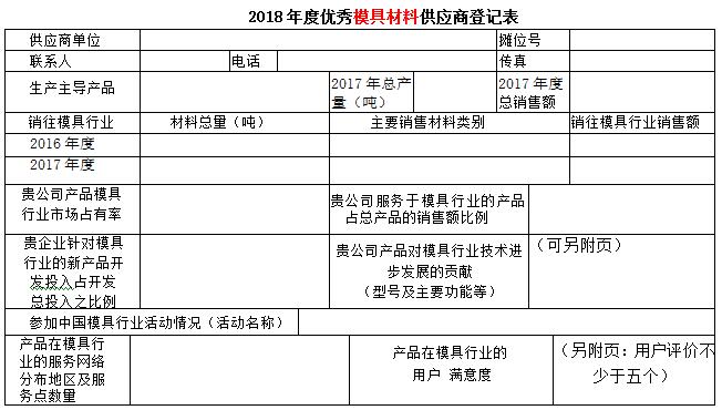 现代模具工业是高技术背景下的资金和技术密集型工业。随着模具行业的发展,现代模具要实现数字化设计、数字化制造、数字化管理、数字化生产流程来实现模具工业的现代化。模具材料是降本提质增效的重要至关领域,为了服务模具企业提高模具材料使用,提升使用的能力, 第十八届中国国际模具技术和设备展览会主办单位之一的米优app怎么注册十分注重展览会的内涵,在历届展览会上均开展了对展览会展品的评述工作,至今已成定式。为了更好地为模具企业提供多元的服务,为企业的模具制造加工解决方案提供保障,进一步推动模具及模具相关行业交流与互动,在第十八届中国国际模具技术和设备展览会期间,米优app怎么注册委托米优app怎么注册模具材料委员会,本着自愿的原则,依据供应商装备水平,在模具行业服务水平、市场占有率的高低、对模具行业服务满意等行业贡献指标,并结合模具企业的意见开展评定优秀模具材料供应商活动,活动不收取参评单位任何费用。现将优秀模具材料供应商登记表发给你们,请予认真填写,尽快返回米优app怎么注册模具材料委员会 迟宏宵 收。