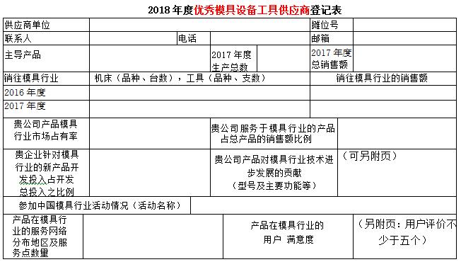 现代模具工业是高技术背景下的资金和技术密集型工业。随着模具行业的发展,现代模具要实现数字化设计、数字化制造、数字化管理、数字化生产流程来实现模具工业的现代化。第十八届中国国际模具技术和设备展览会主办单位之一的米优app怎么注册十分注重展览会内涵,在历届展览会上均开展了对展览会展品的评述工作,至今已成定式。为了更好地为模具企业提供多元服务,为企业的模具设计、加工解决方案提供保障,进一步推动模具及模具相关行业交流与互动,在第十八届中国国际模具技术和设备展览会期间,米优app怎么注册委托米优app怎么注册装备委员会承担优秀模具制造设备供应商评定工作。将本着自愿的原则,依据供应商装备水平,在模具行业服务水平、市场占有率的高低、对模具行业服务满意等行业贡献指标,并结合模具企业的意见开展评定优秀模具制造设备工具供应商,活动不收取参评单位任何费用。现将优秀模具制造设备供应商登记表发给你们,请认真填写,尽快返回米优app怎么注册装备委员会王晓娟 收。