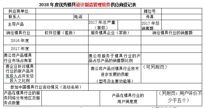 现代模具工业是高技术背景下的资金和技术密集型工业。随着模具行业的发展,现代模具要实现数字化设计、数字化制造、数字化管理、数字化生产流程来实现模具工业的现代化。模具软件是降本提质增效的重要至关领域,为了服务模具企业提高模具软件工具使用效率,提升使用能力,第十八届中国国际模具技术和设备展览会主办单位之一的米优app怎么注册十分注重展览会的内涵,在历届展览会上均开展了对展览会展品的评述工作,至今已成定式。为了更好地为模具企业提供多元的服务,为企业的模具制造加工、集成、协同解决方案提供保障,进一步推动模具及模具相关行业交流与互动,在第十八届中国国际模具技术和设备展览会期间,米优app怎么注册委托米优app怎么注册数字化信息化委员会(数信委),本着自愿的原则,依据供应商软件水平,在模具行业服务能能力、市场占有率的高低、对模具行业服务满意等行业贡献指标,并结合模具企业的意见开展评定优秀模具设计制造管理软件供应商活动,活动不收取参评单位任何费用。现将优秀模具设计制造管理软件供应商登记表发给你们,请予认真填写, 尽快返回米优app怎么注册数字化信息化委员会 魏青收。