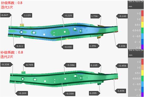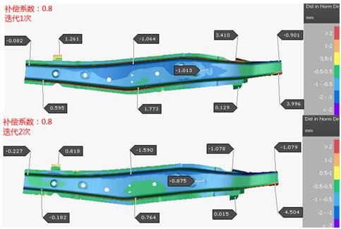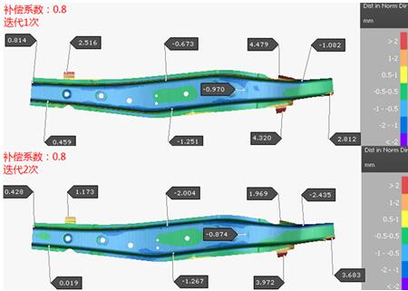再次尝试进行补偿系数为0.8的补偿,其补偿后的回弹结果如图10所示,由回弹补偿的结果可知,两次迭代的补偿效果均比补偿系数为1的效果好,但是零件的法兰区域的回弹还是较大,还需要改善。再尝试用补偿系数为0.9、1.1和1.2来进行补偿,补偿效果均不如补偿系数为0.8的,所以最终确定选用0.8作为最佳的补偿系数来进行其它方案的补偿。