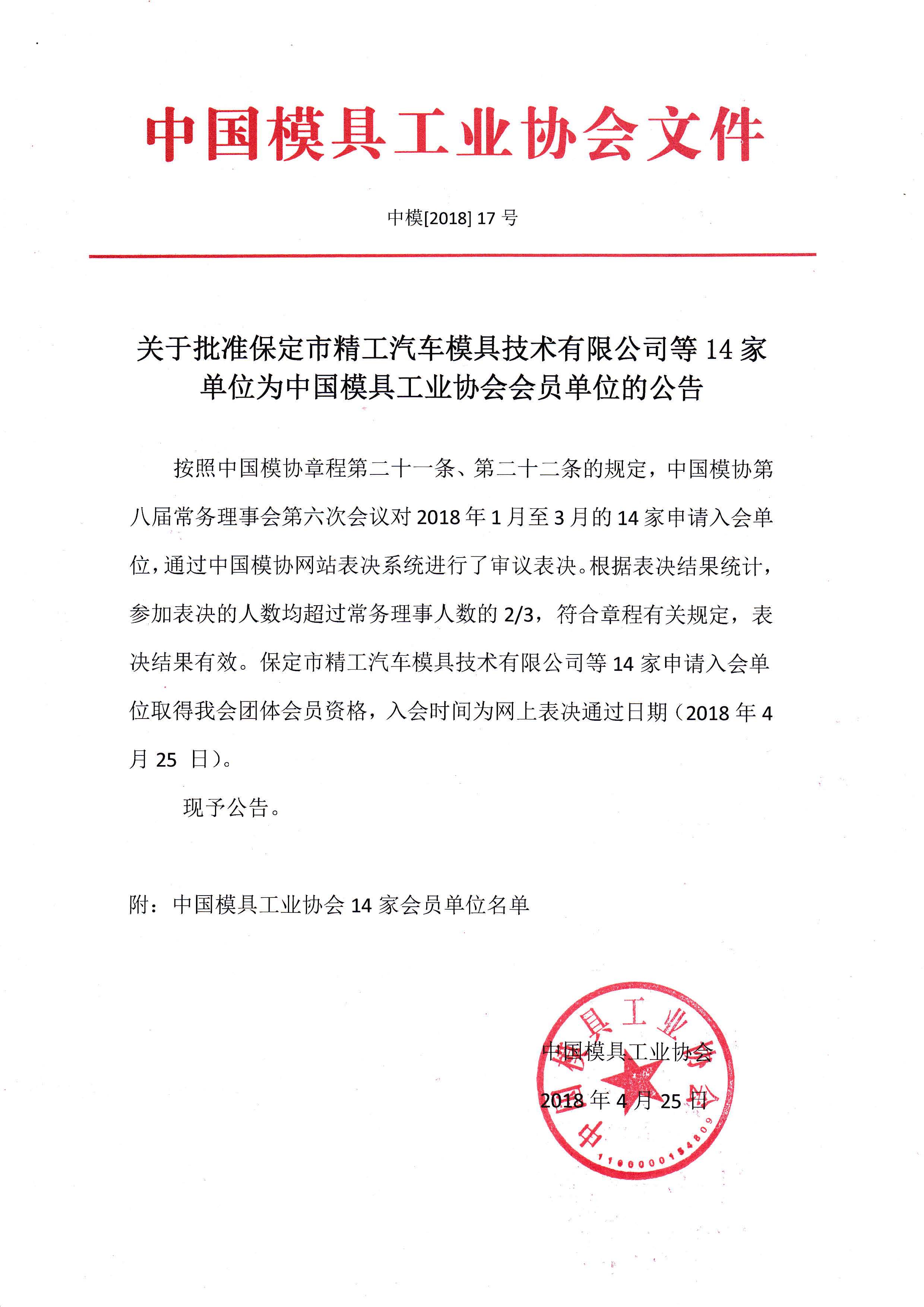 关于批准保定市精工汽车模具技术有限公司等14家单位为米优app怎么注册会员单位的公告