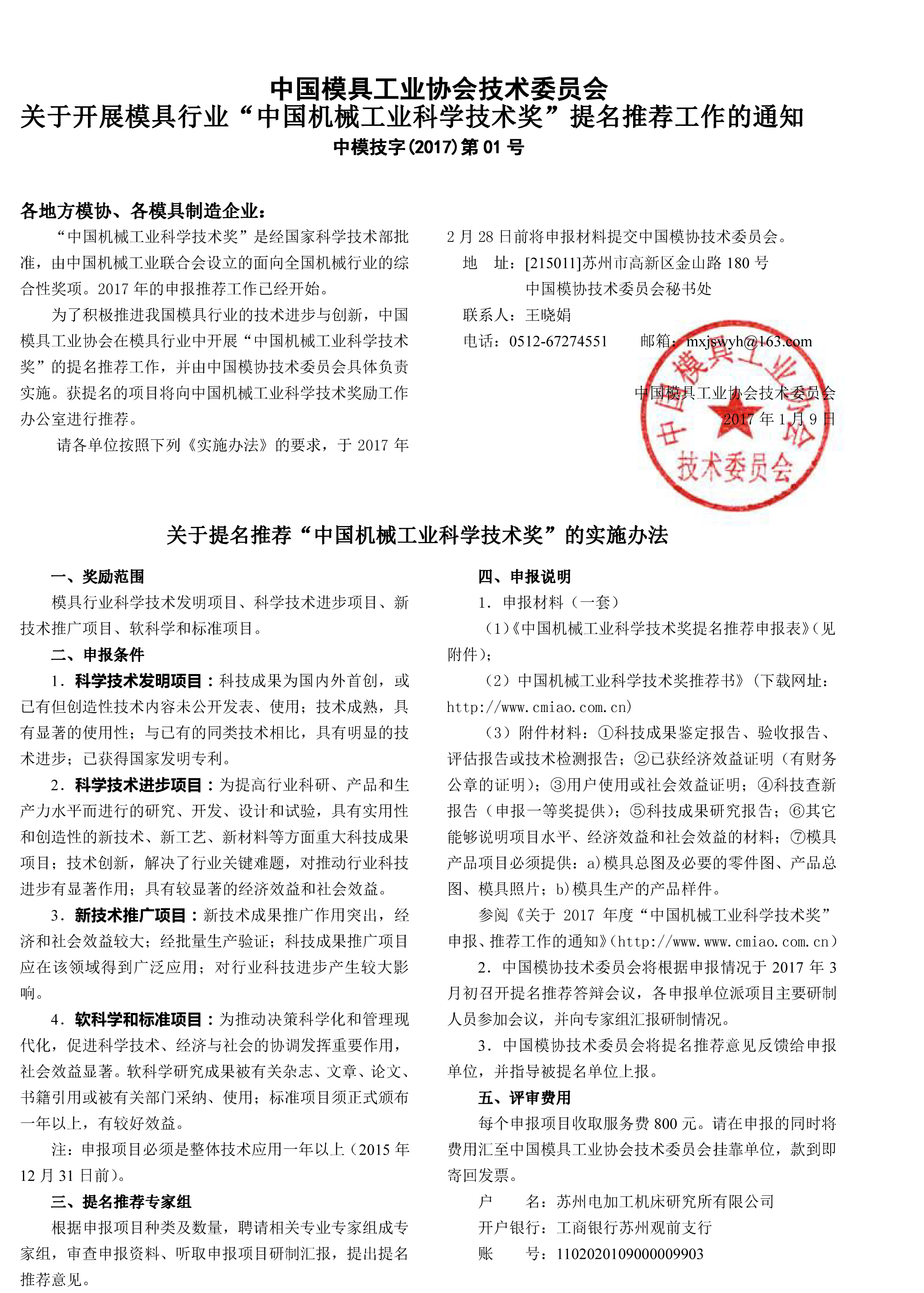 参阅《关于2017年度“中国机械工业科学技术奖”申报、推荐工作的通知》(http://www.cmiao.com.cn)