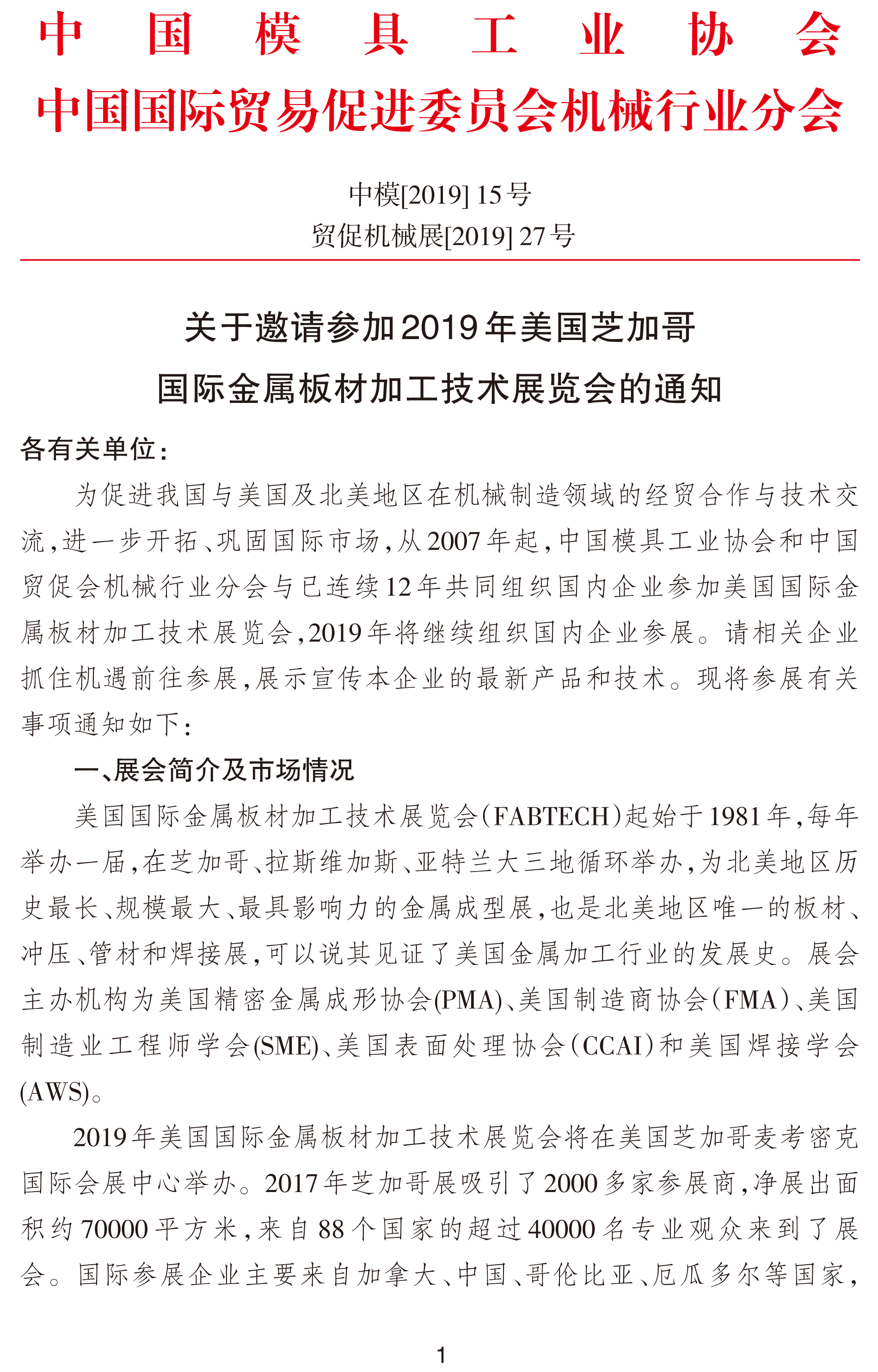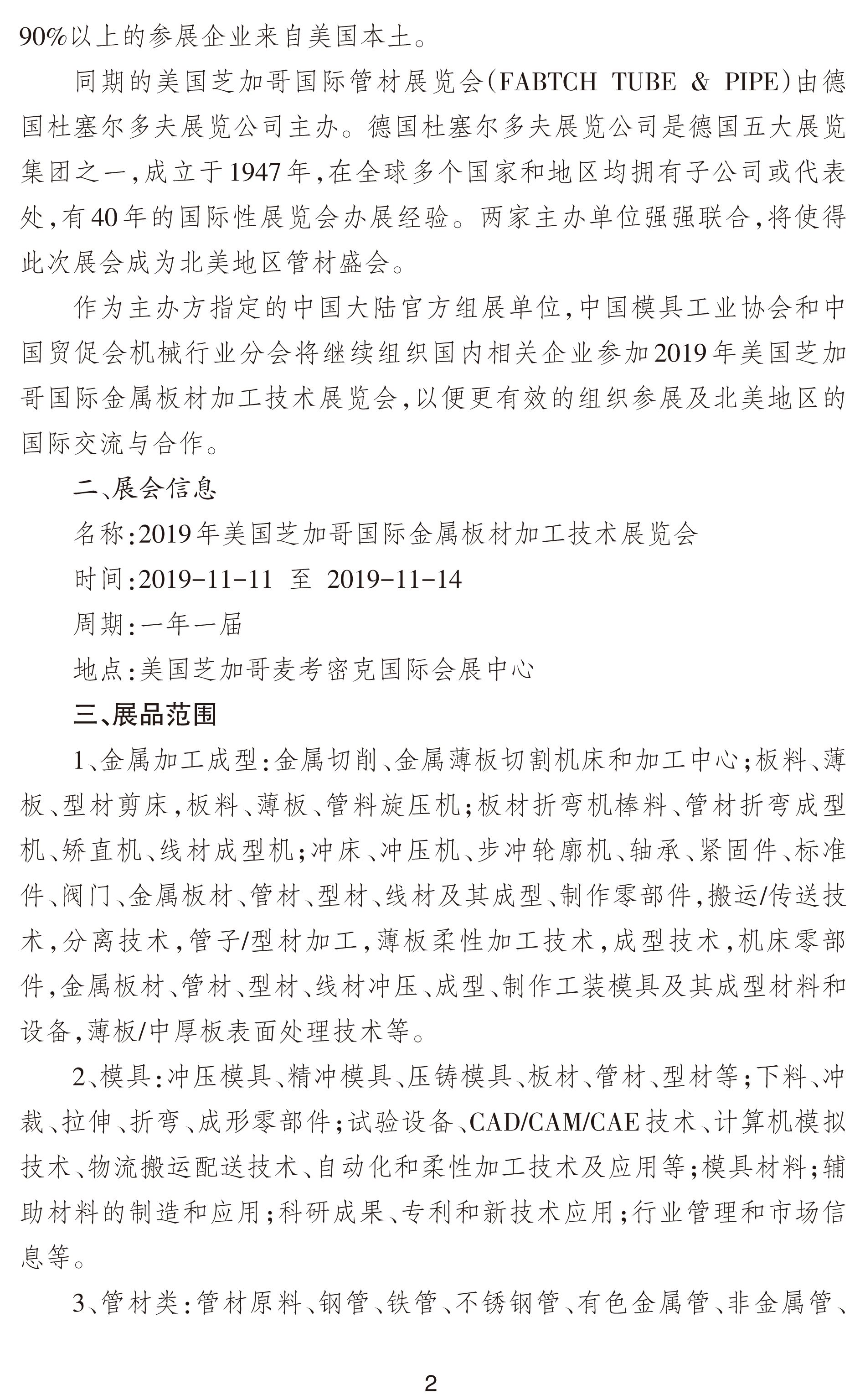 关于邀请参加2019年美国芝加哥国际金属板材加工技术展览会的通知