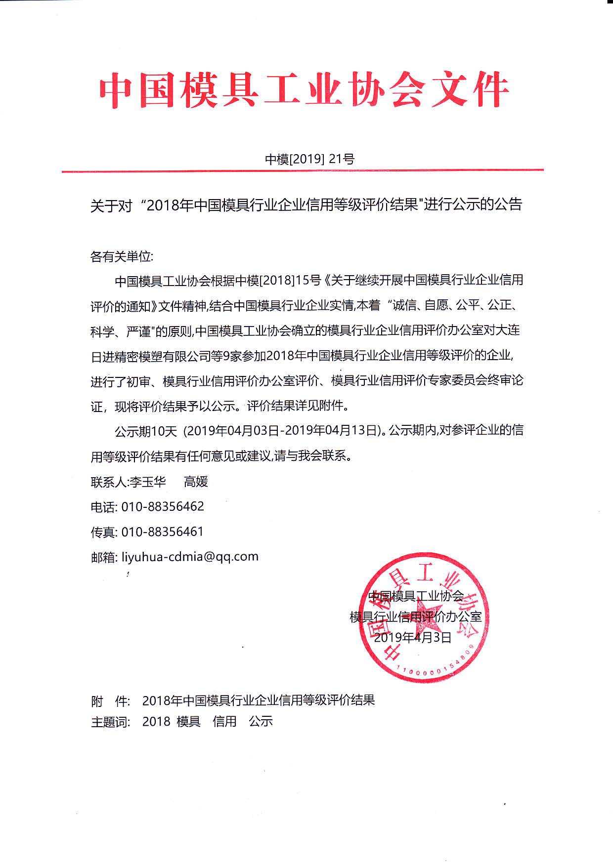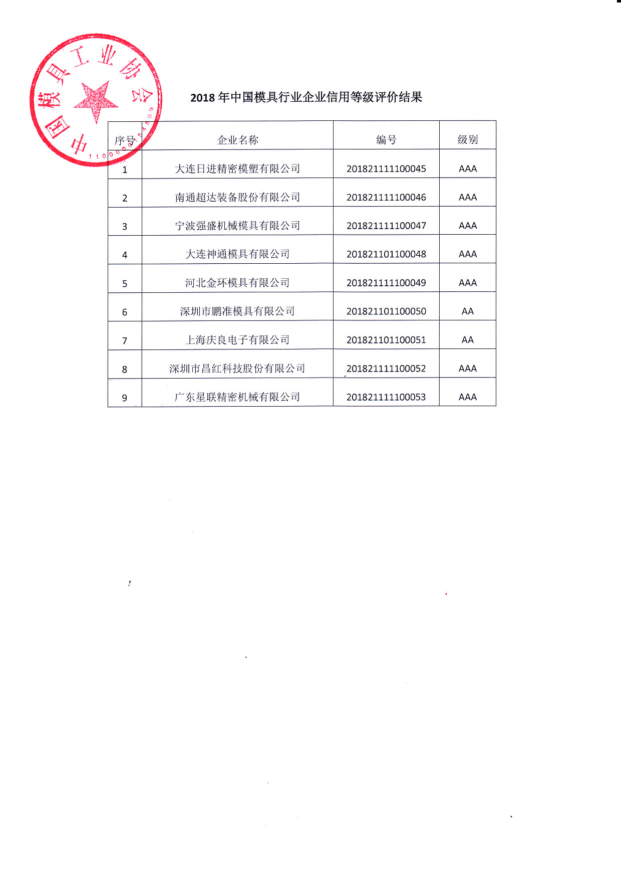 关于对“2018年中国模具行业企业信用等级评价结果”进行公示的公告