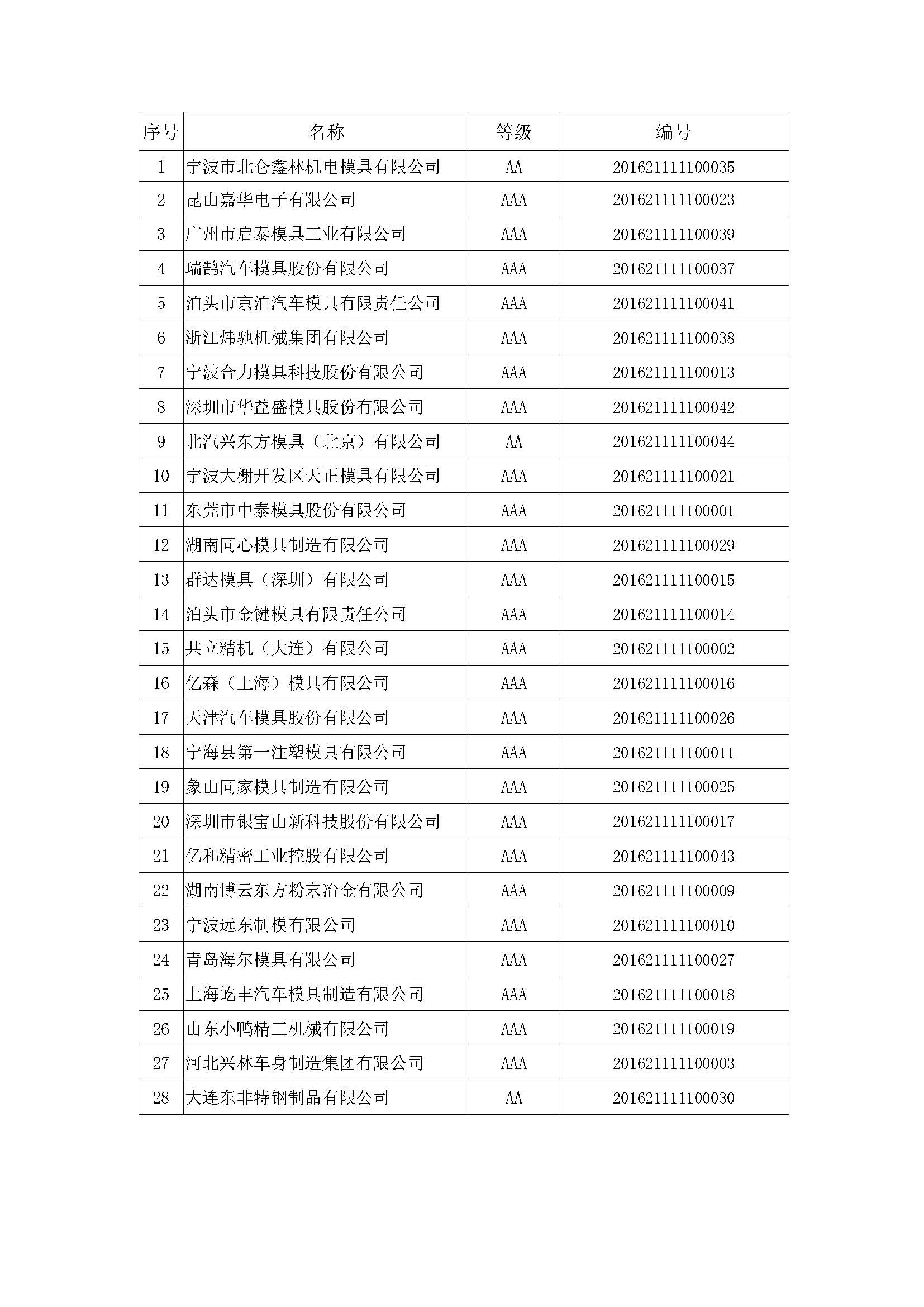 关于对“2016年中国模具行业企业信用等级评价(复评)结果”进行公示的公告
