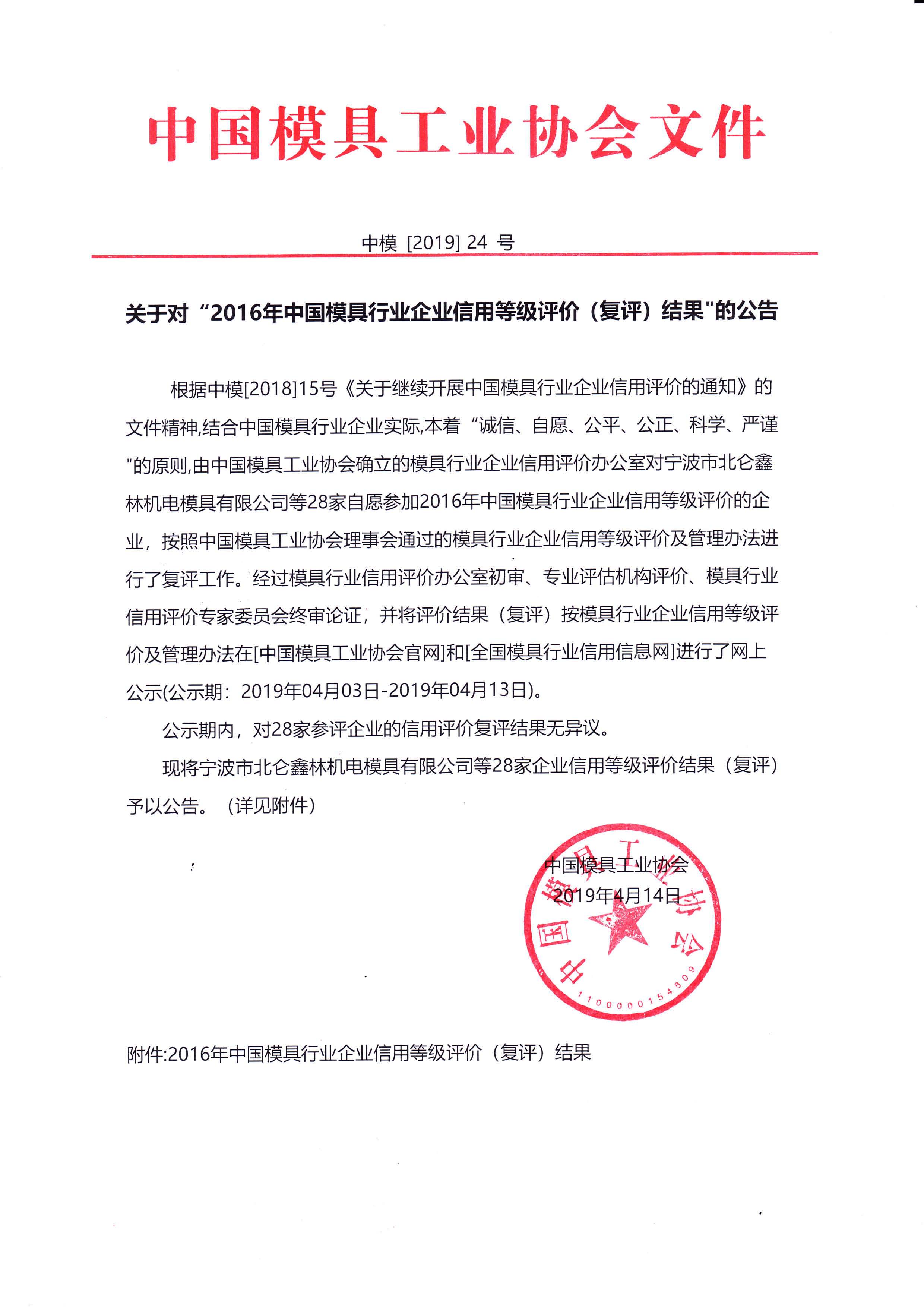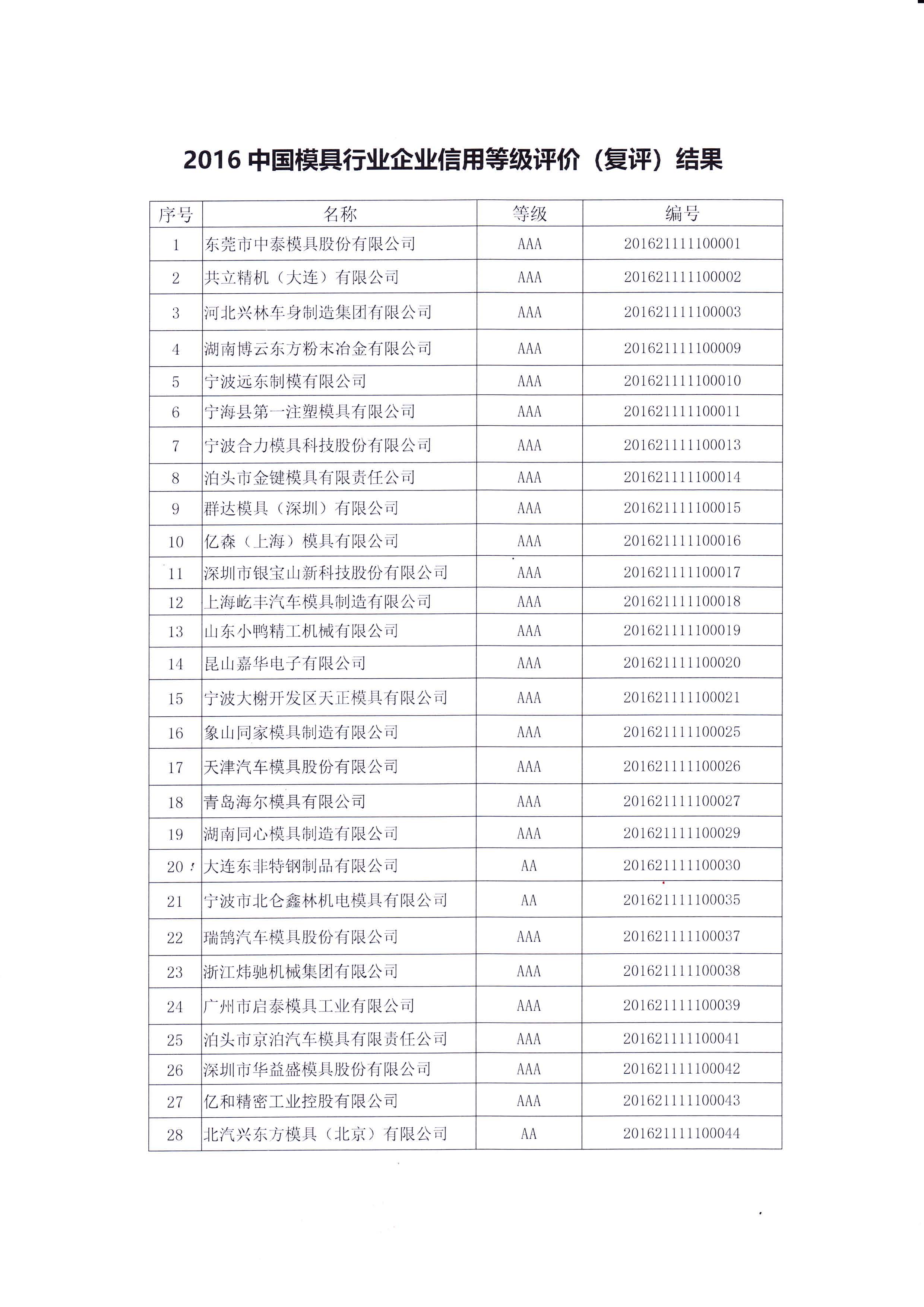 关于对“2016年中国模具行业企业信用等级评价(复评)结果”的公告