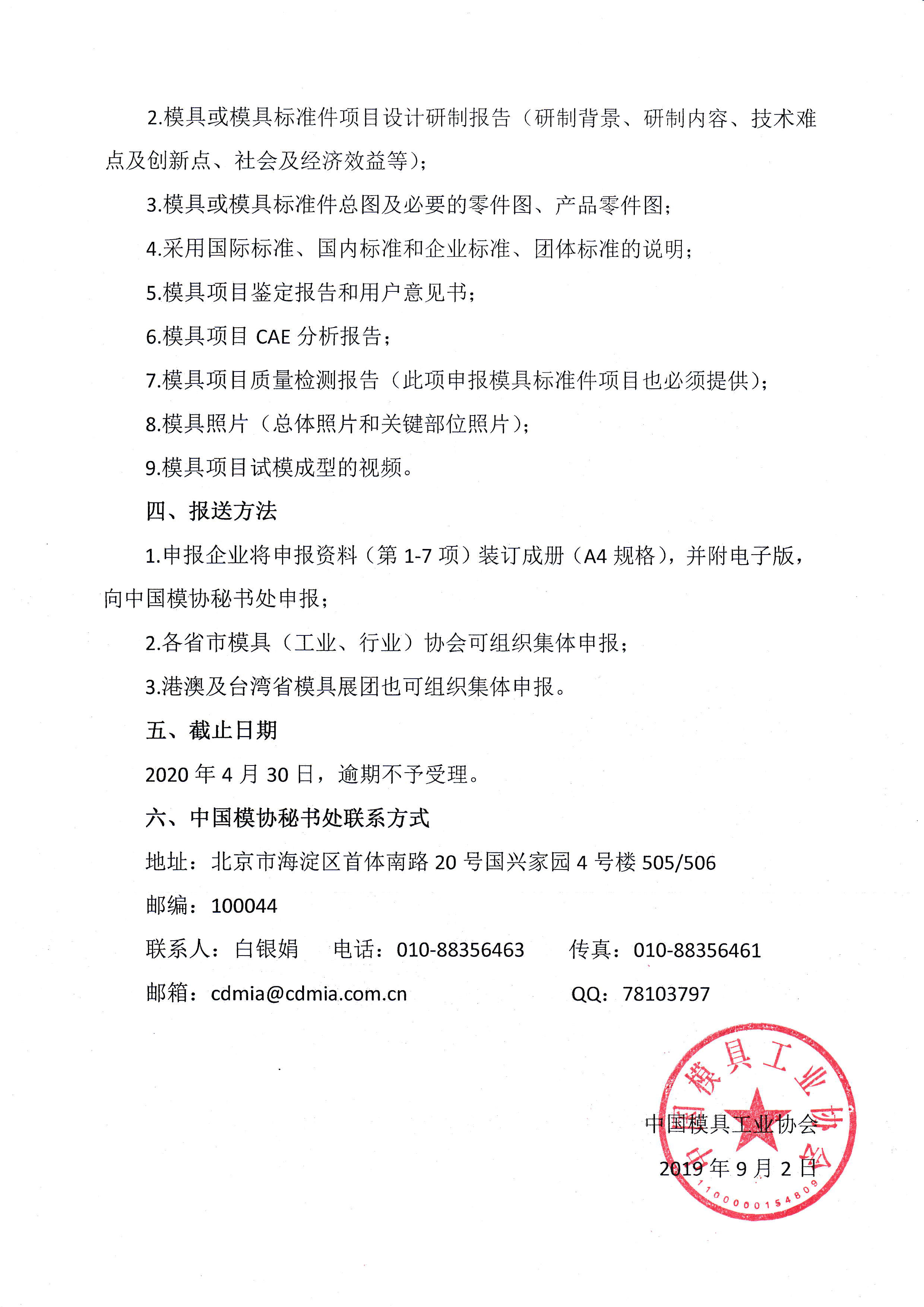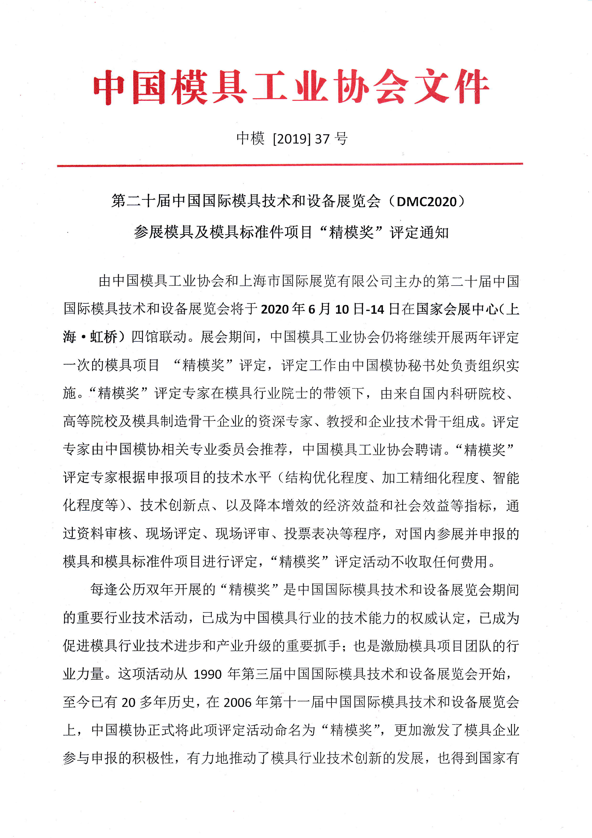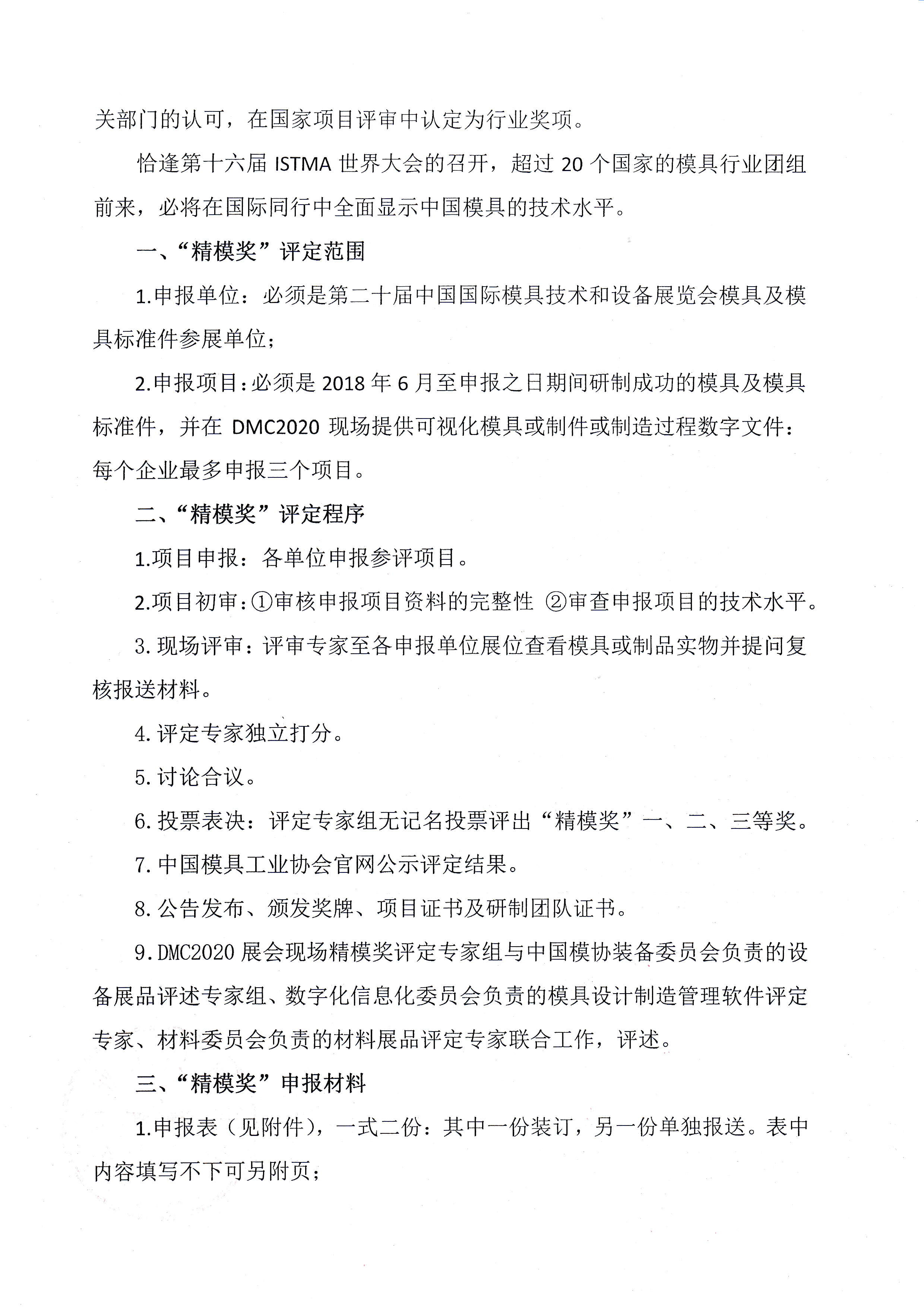 第二十届中国国际模具技术和设备展览会(DMC2020)参展模具及模具标准件项目“精模奖”评定通知