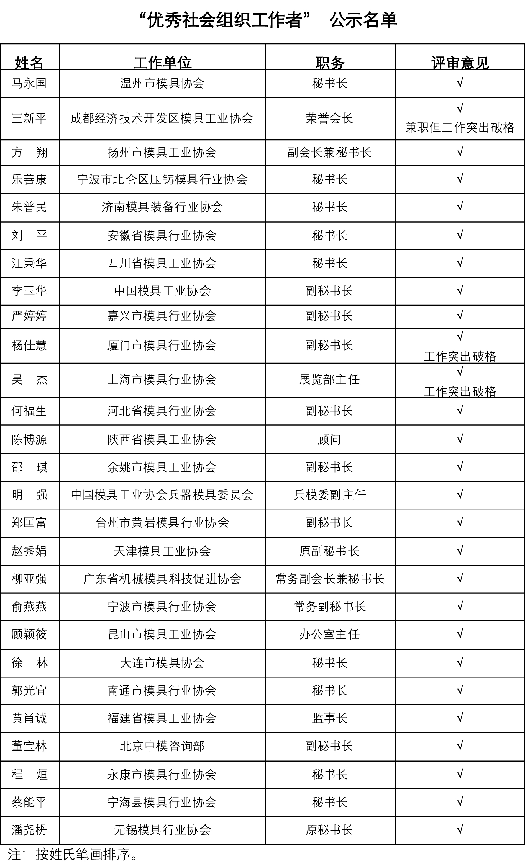 依据“优秀社会组织工作者”评选方案,中国模协在模具行业协(学)会中开展“优秀社会组织工作者”评选活动。按照程序,各地方协(学)会,根据 “优秀社会组织工作者”推荐条件,推荐本地区的候选人名单;按“优秀社会组织工作者”评选办法,中国模协秘书处对候选人材料进行初审、汇总,由中国模协常务理事、理事中产生的评选工作组评选;由中国模协驻会会长、部分副会长、秘书长、常务理事代表组成的评选领导小组核准确认。经过充分评选,确定的27 名“优秀社会组织工作者” 评选结果,在米优app怎么注册官网公示如下,公示期2019年11月8日-14日。