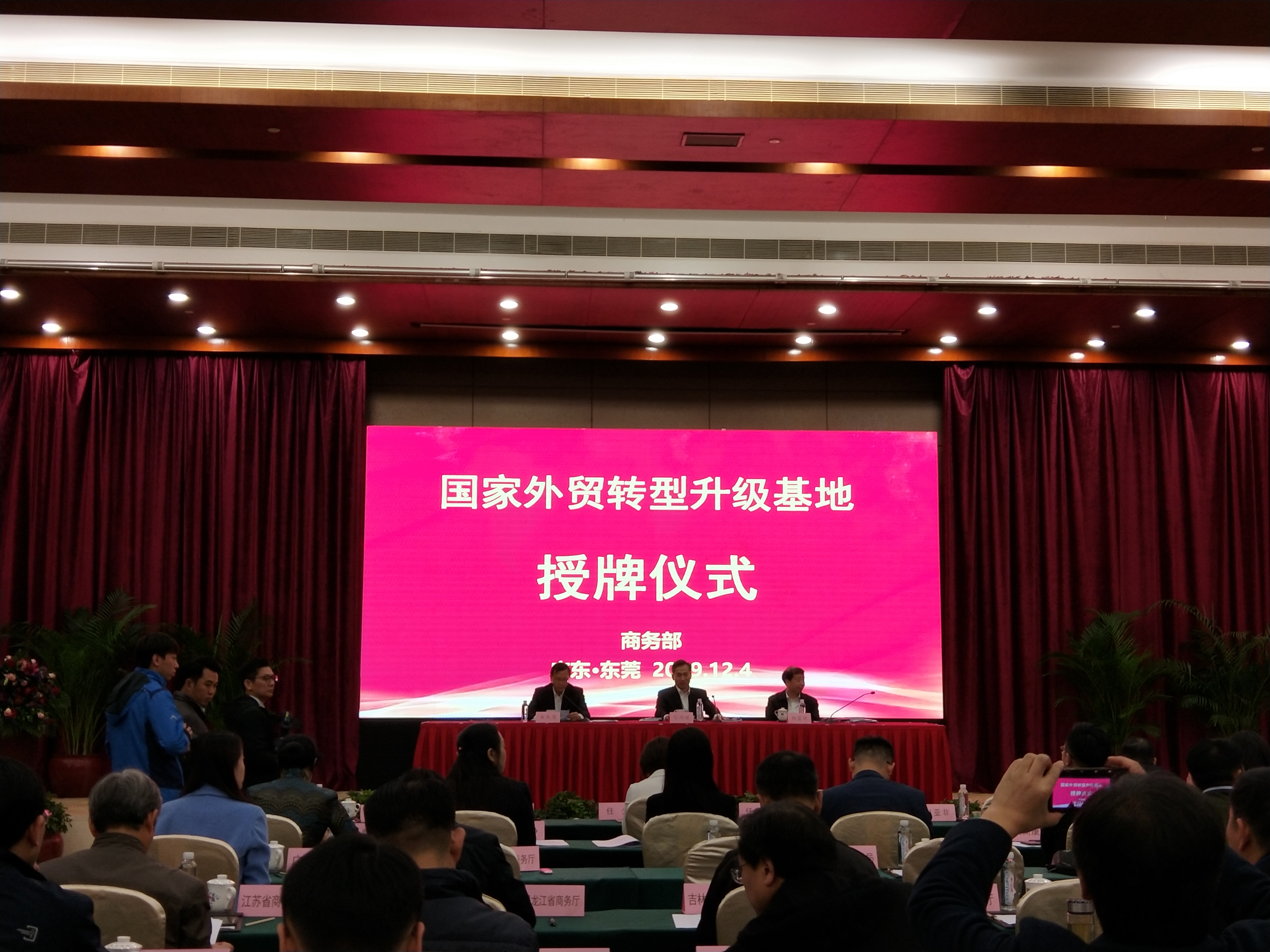 12月4日,商务部国家外贸转型升级基地授牌仪式在东莞举行,商务部部长助理任鸿斌为2019 年认定的65 个国家外贸转型升级基地授牌,并在国家外贸转型升级基地建设培训班做了《坚持新发展理念,加快外贸转型升级基地建设推进贸易高质量发展》的专题讲座。商务部外贸司副司长宋先茂、商务部驻广州副特派员谢莹、广东省商务厅副厅长任少、东莞市市长肖亚非、商务部国际商报社副社长史柳石,以及全国各省市商务厅(委、局)与65家基地负责人出席了授牌仪式。