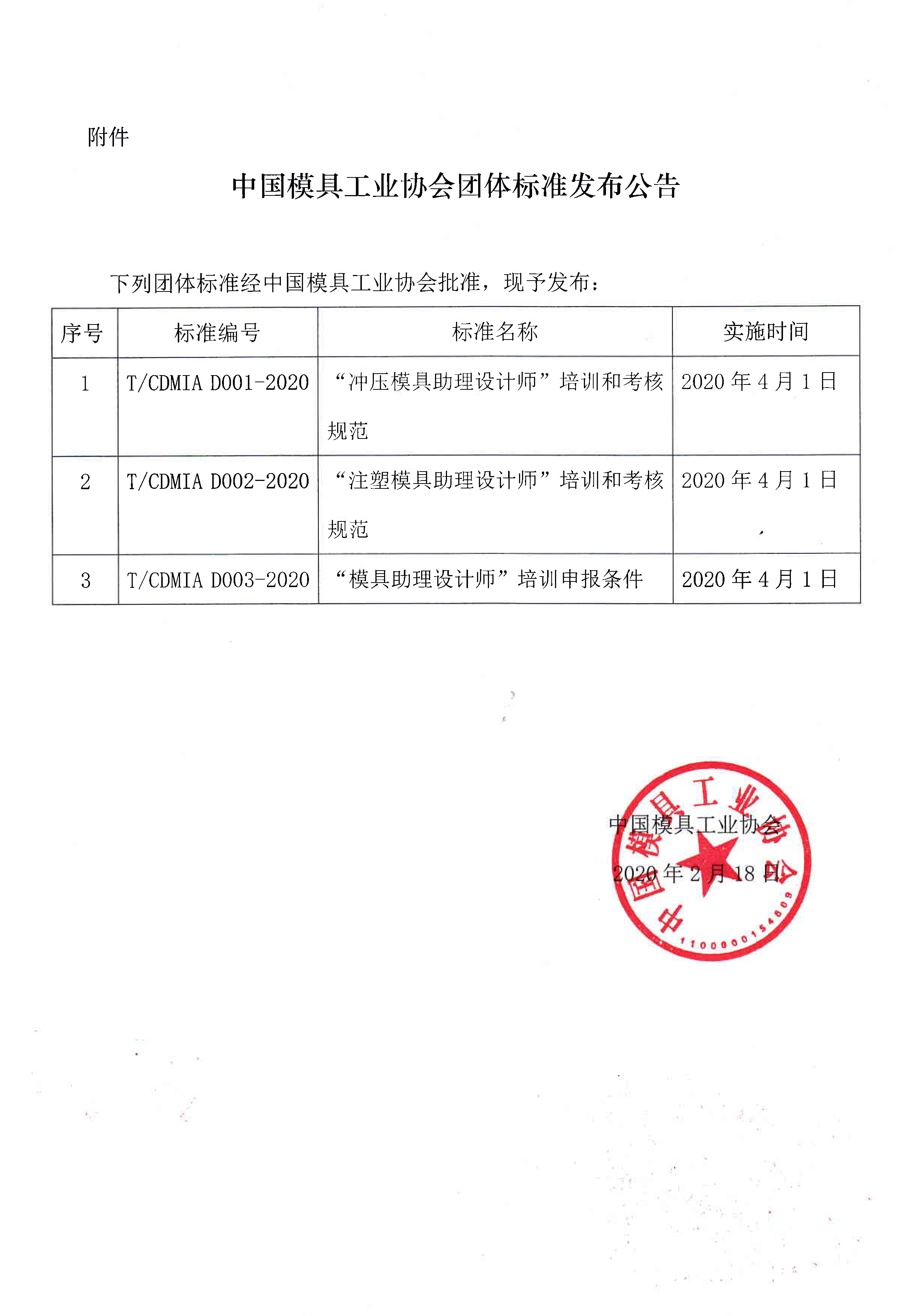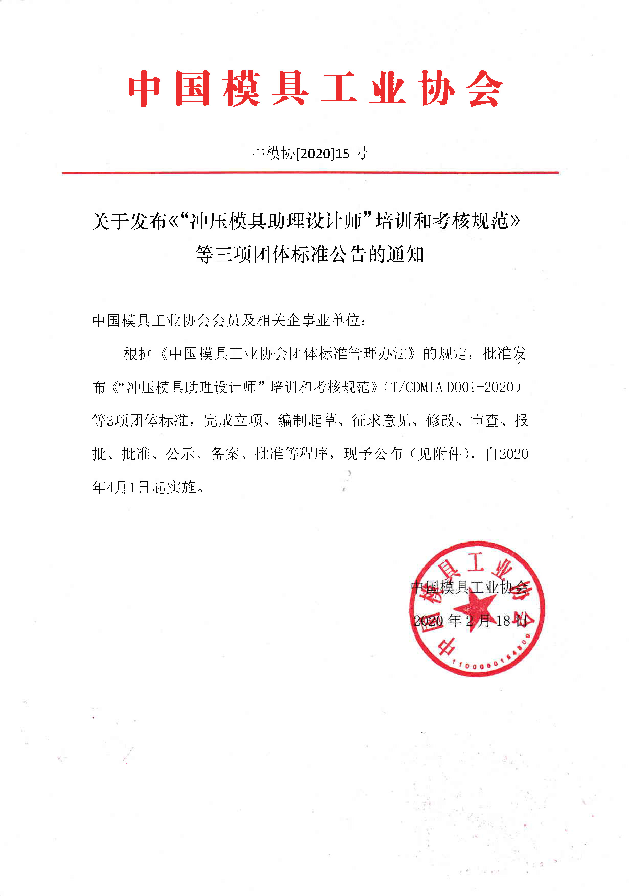 关于发布《“冲压模具助理设计师”培训和考核规范》等三项团体标准公告的通知