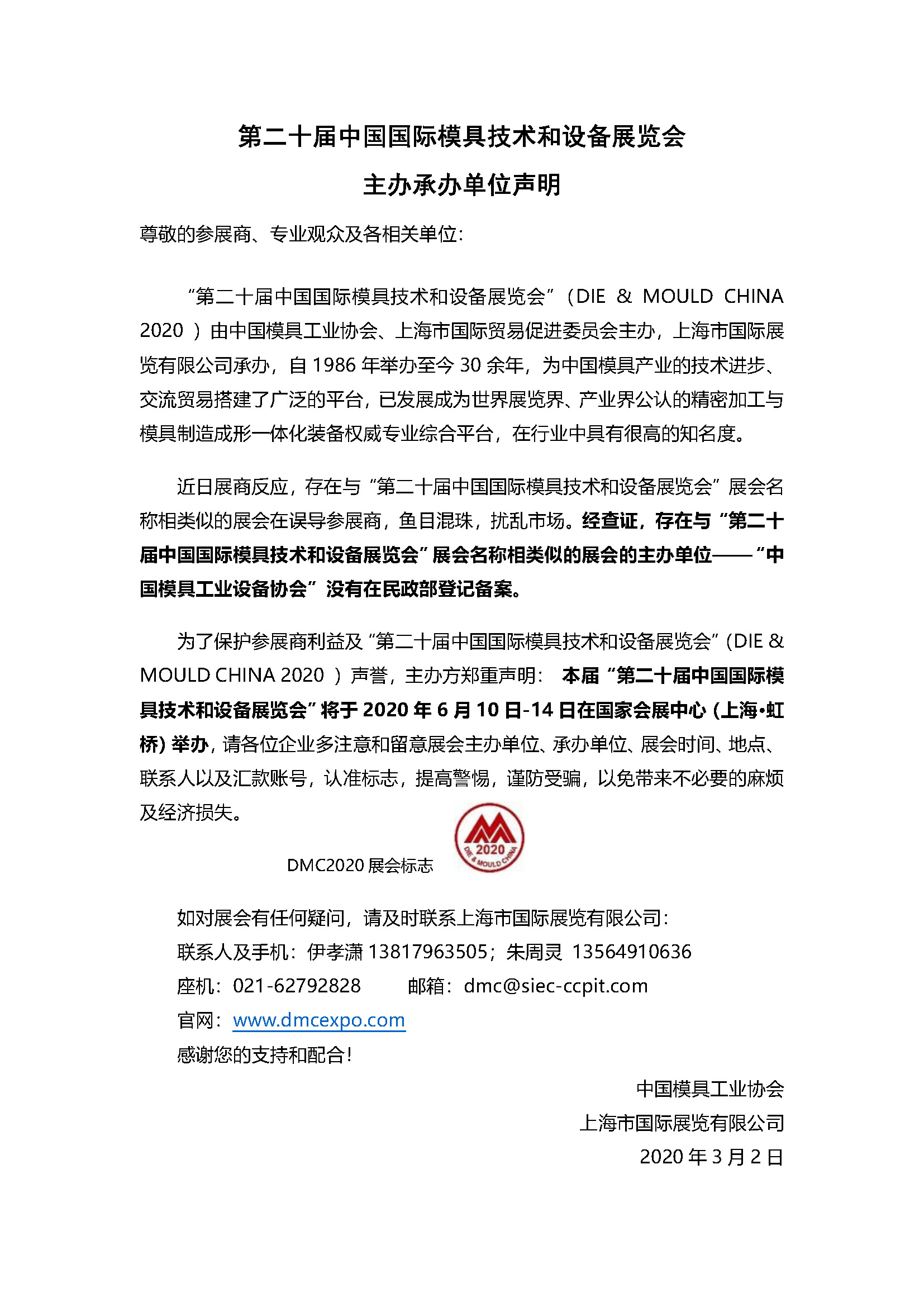 第二十届中国国际模具技术和设备展览会主办承办单位声明