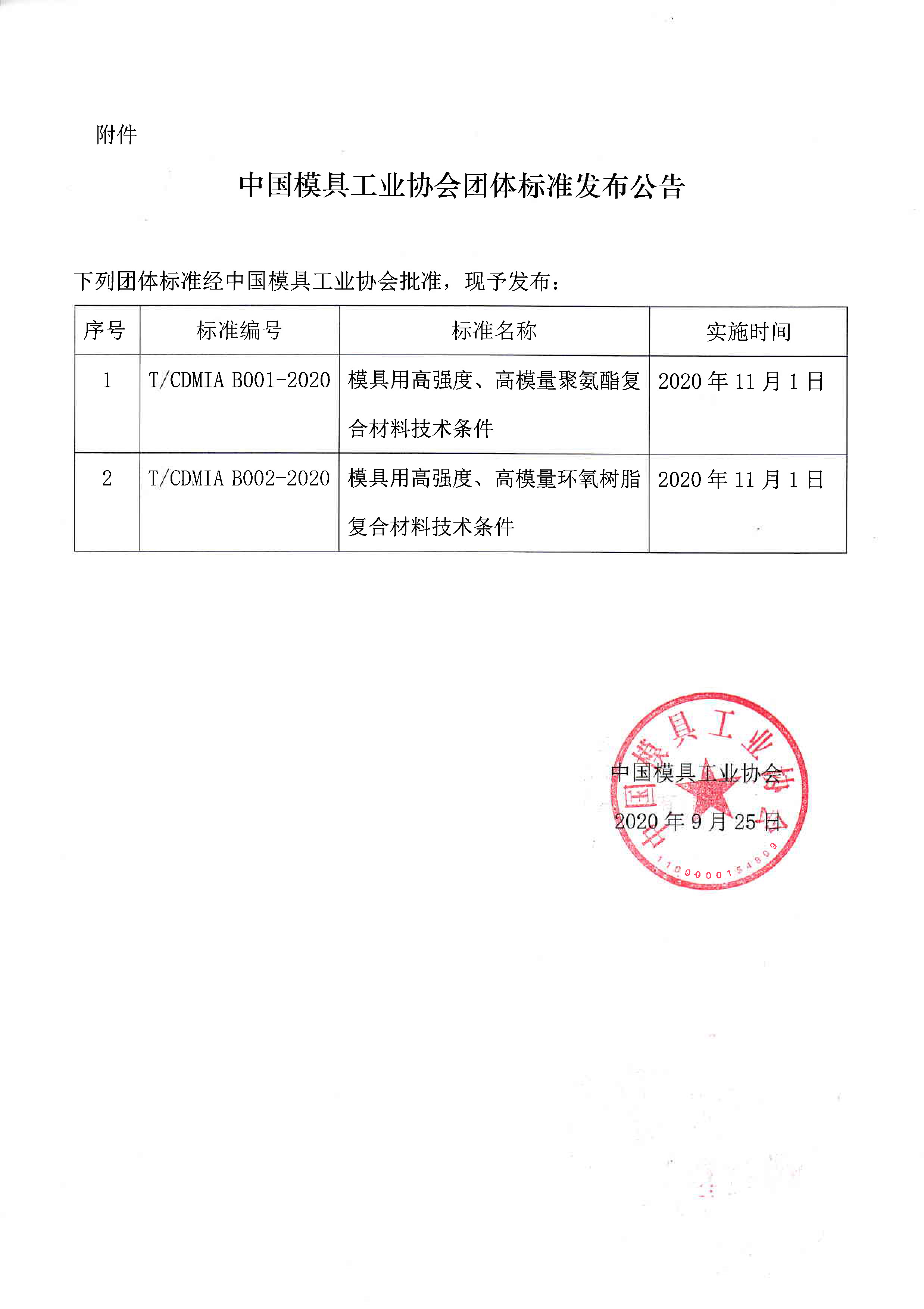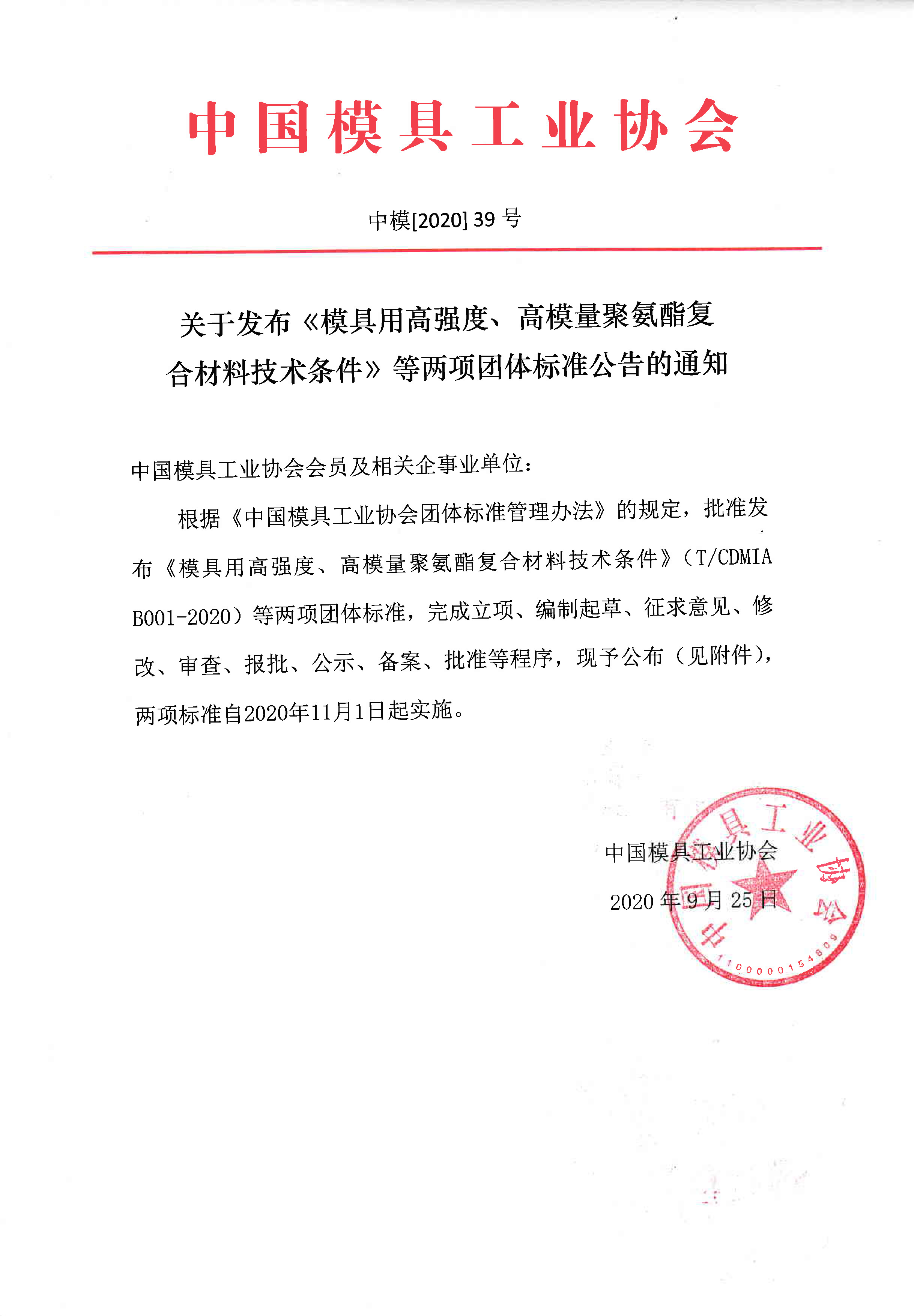 关于发布《模具用高强度、高模量聚氨酯复合材料技术条件》等两项团体标准公告的通知