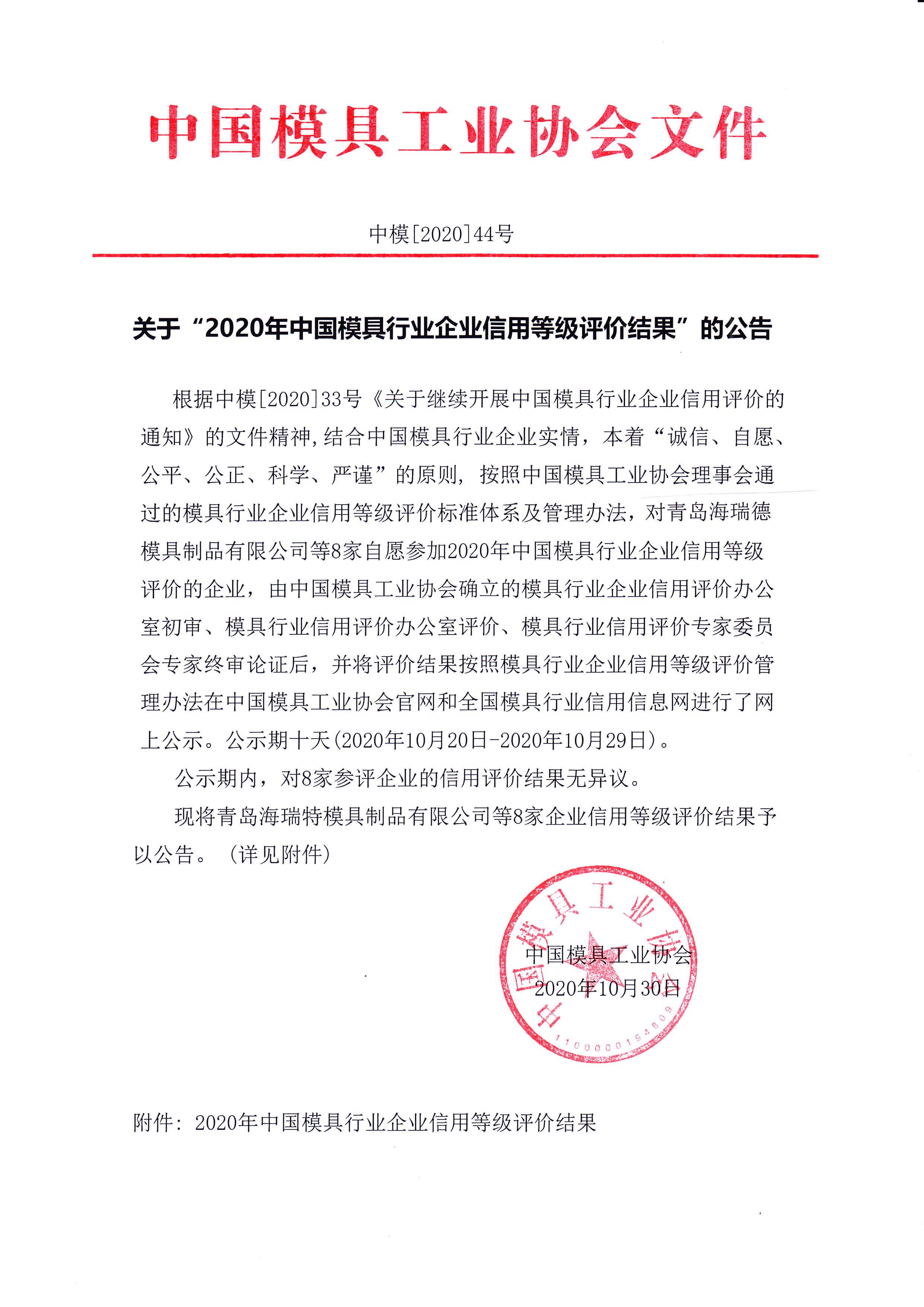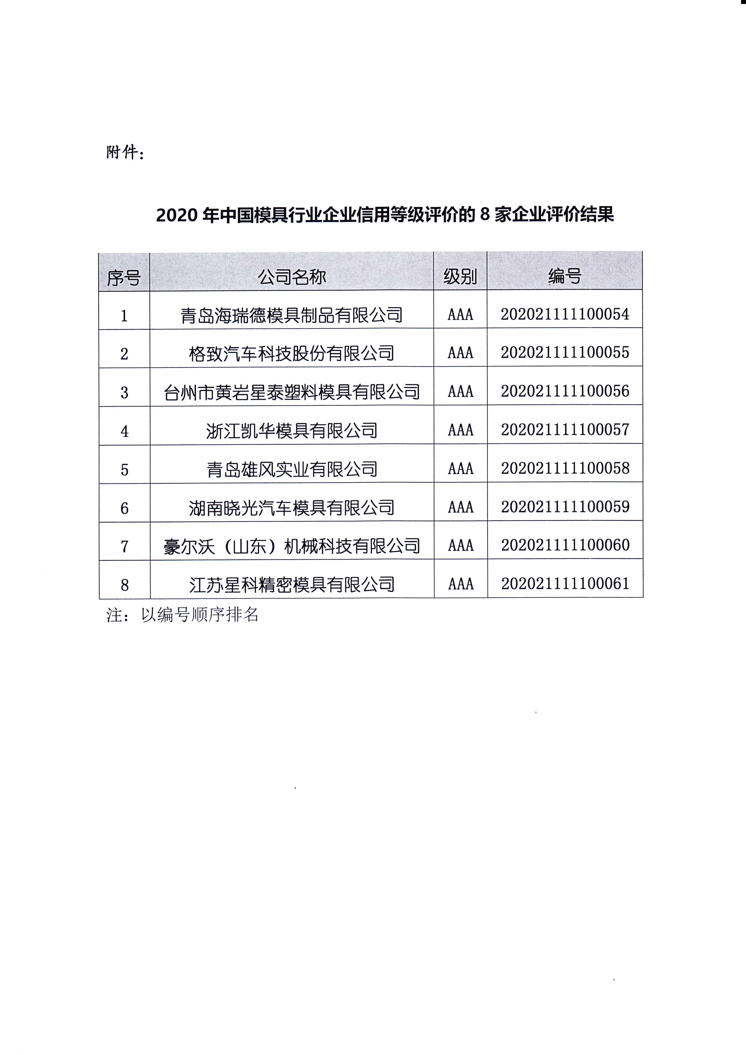 关于“2020年中国模具行业企业信用等级评价结果”的公告