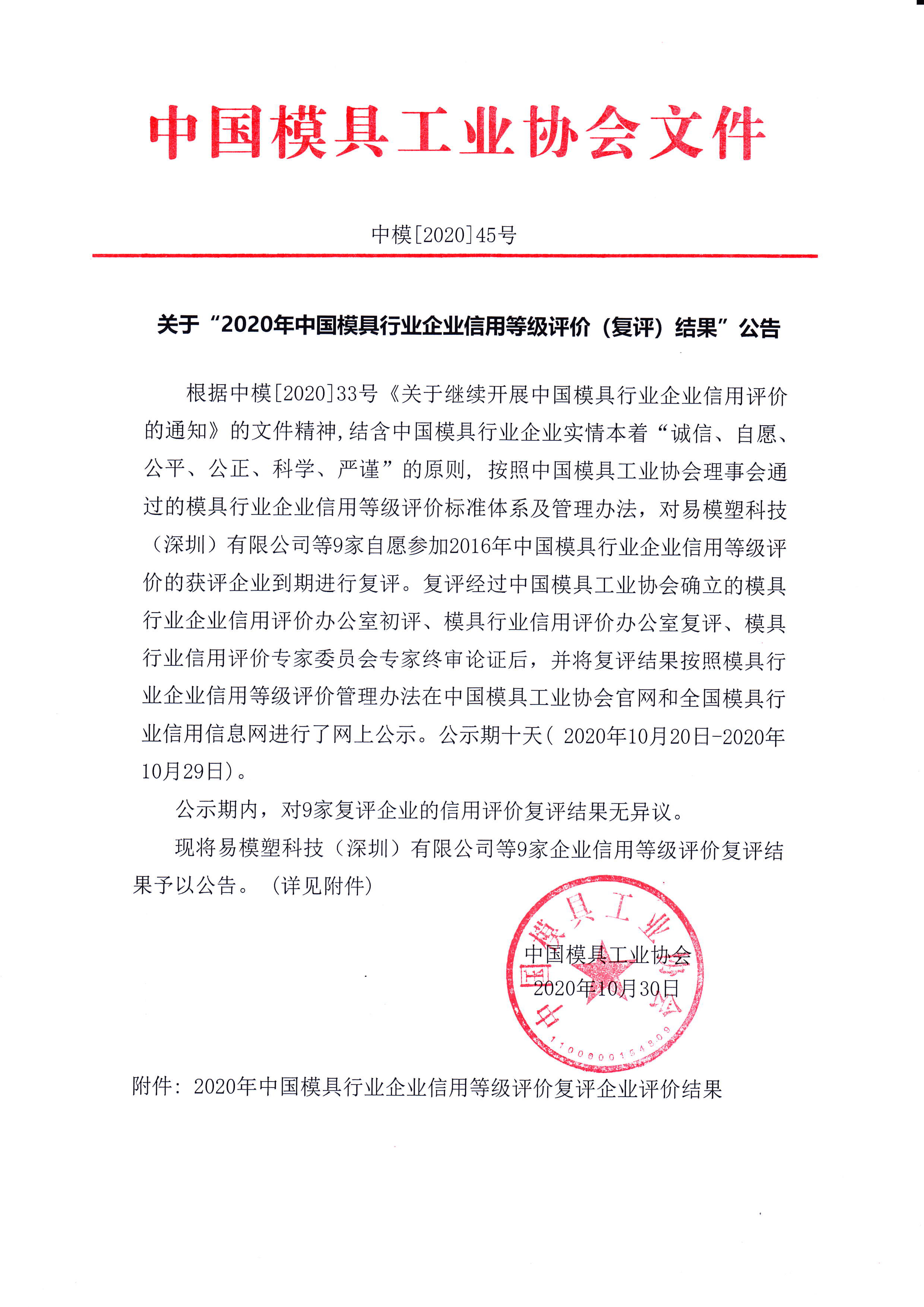 关于“2020年中国模具行业企业信用等级评价(复评)结果”公告