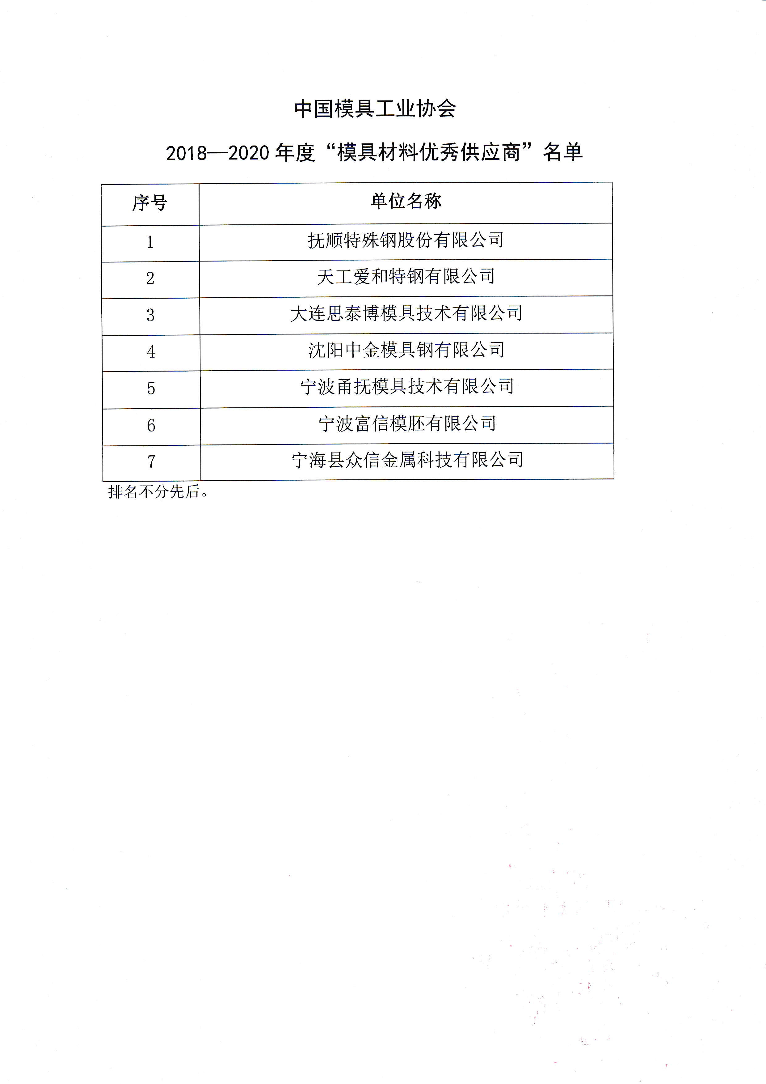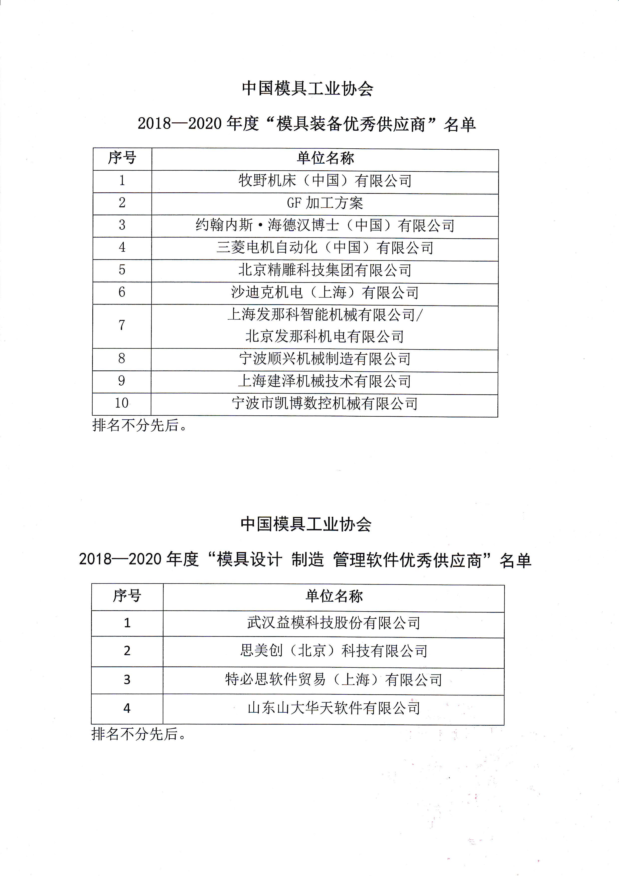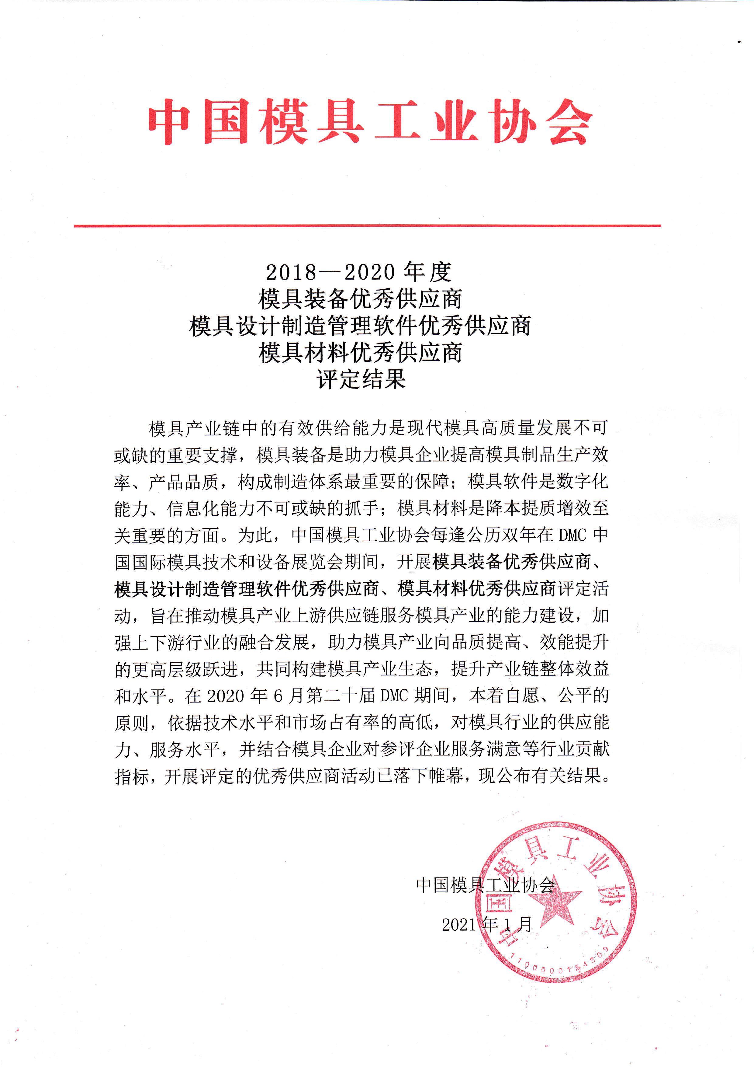 2018—2020年度 模具装备优秀供应商 模具设计制造管理软件优秀供应商 模具材料优秀供应商 评定结果