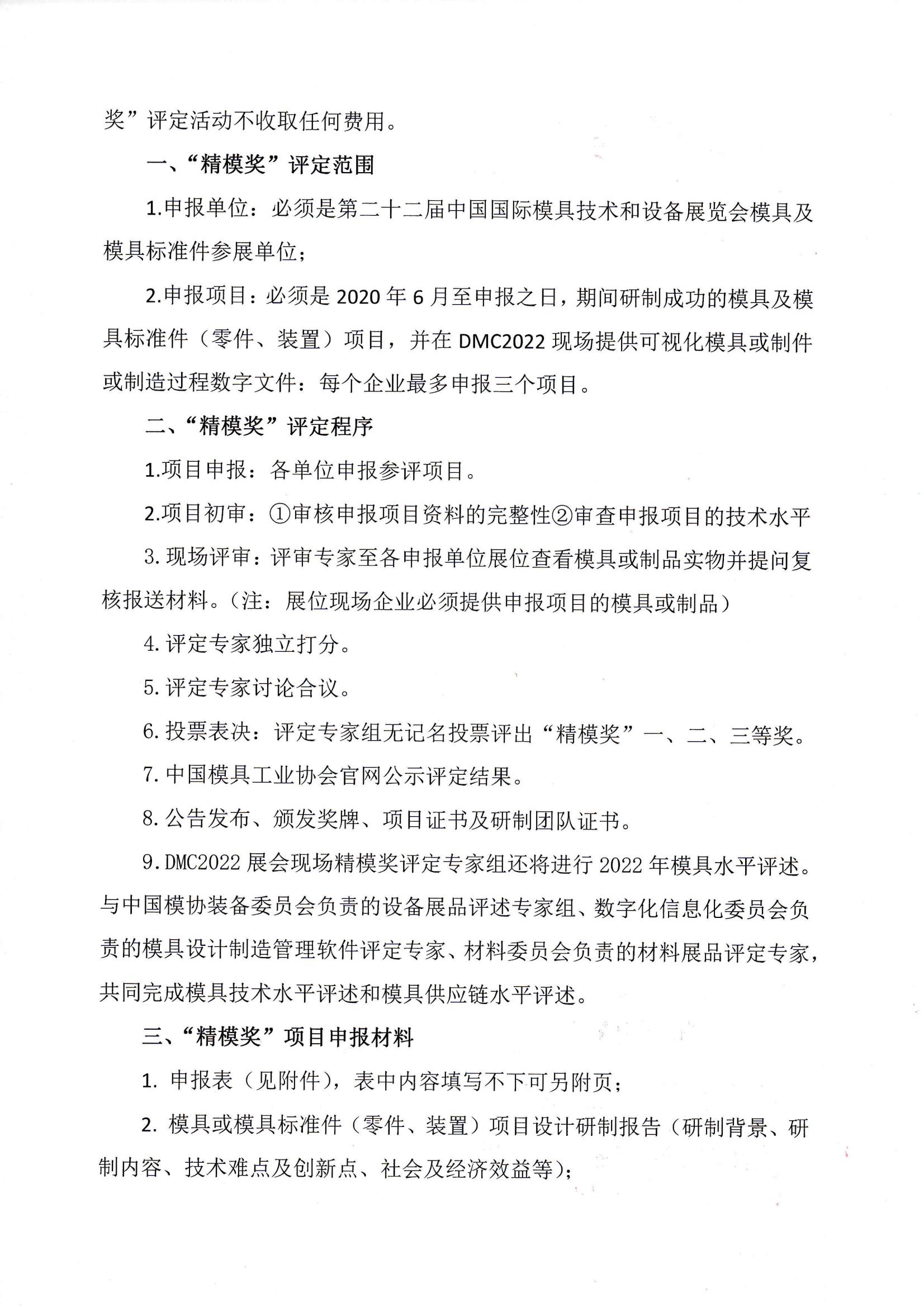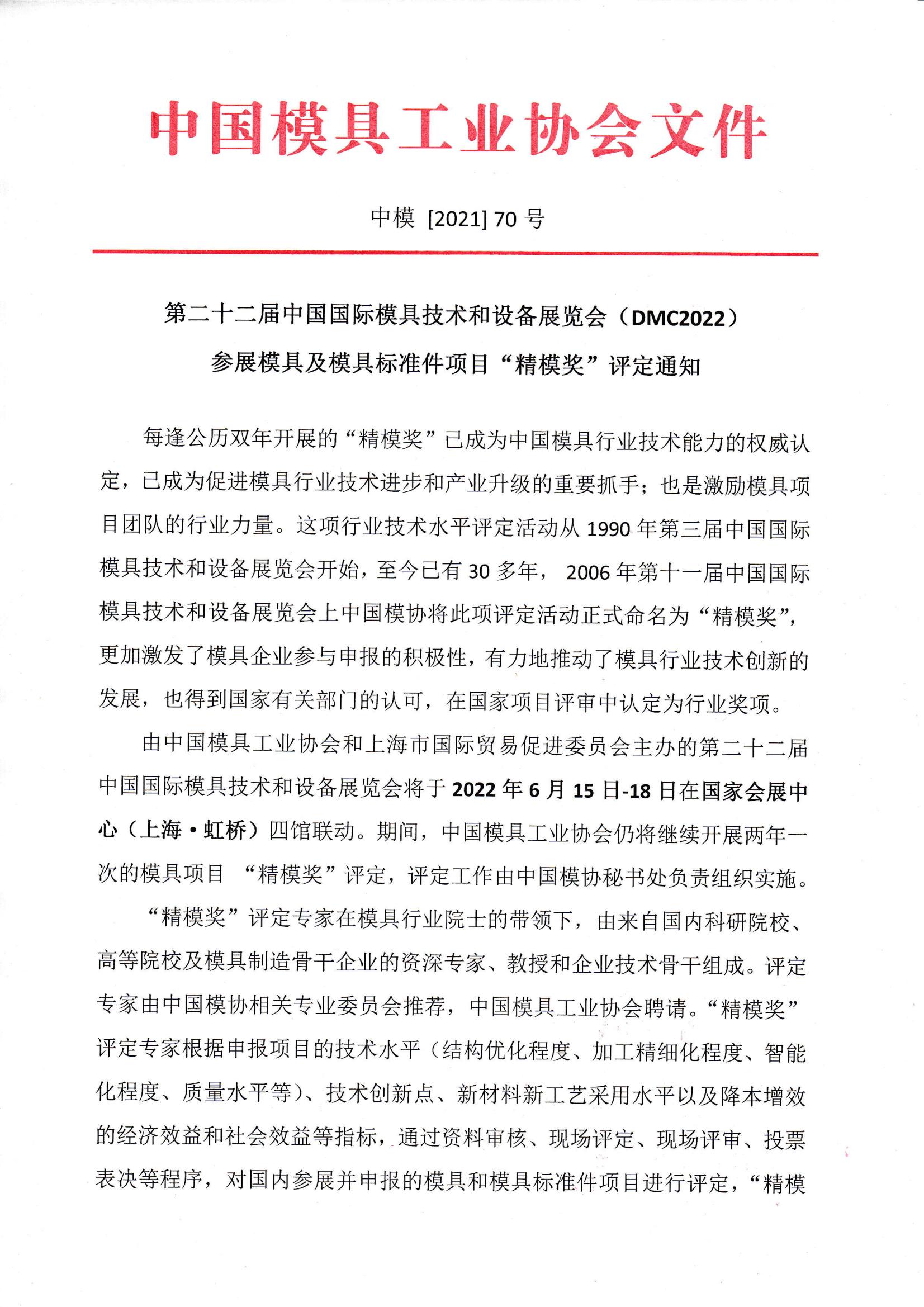 第二十二届中国国际模具技术和设备展览会(DMC2022) 参展模具及模具标准件项目“精模奖”评定通知