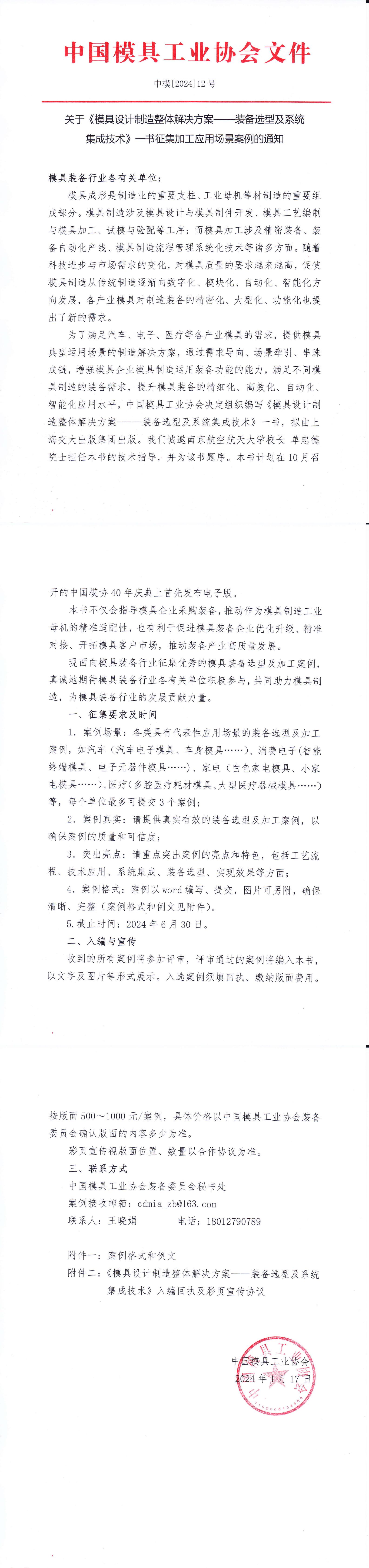 关于《模具设计制造整体解决方案——装备选型及系统集成技术》一书征集加工应用场景案例的通知