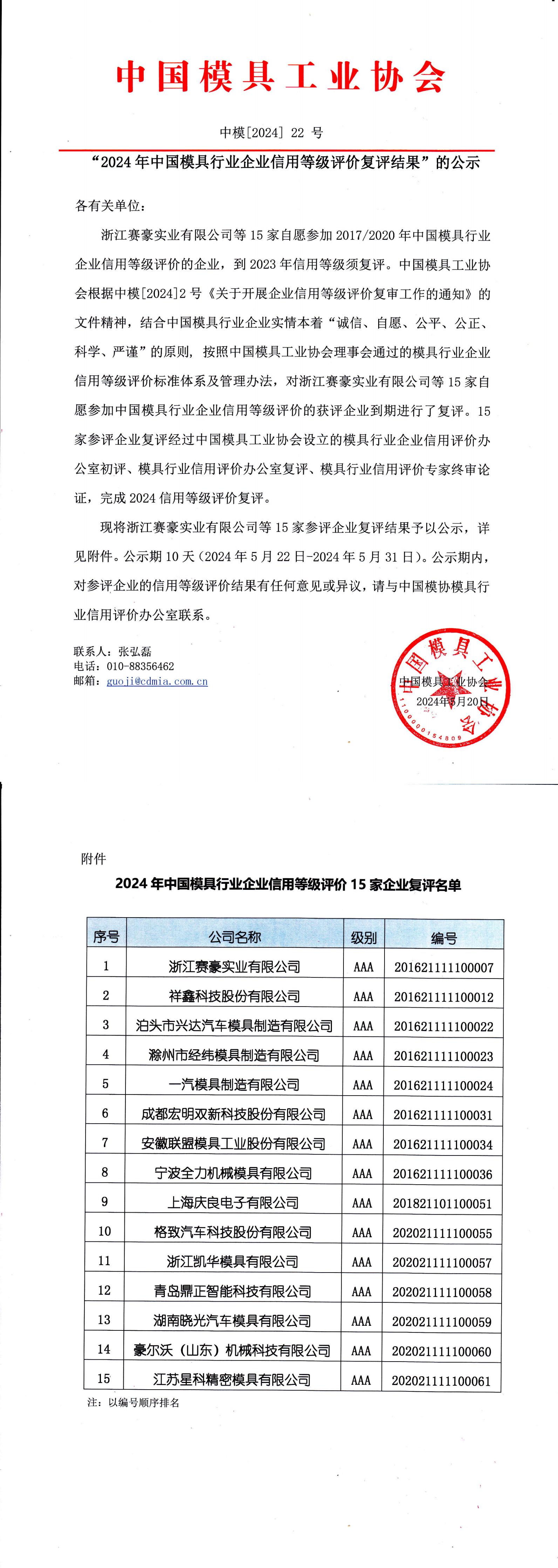 “2024年中国模具行业企业信用等级评价复评结果”的公示