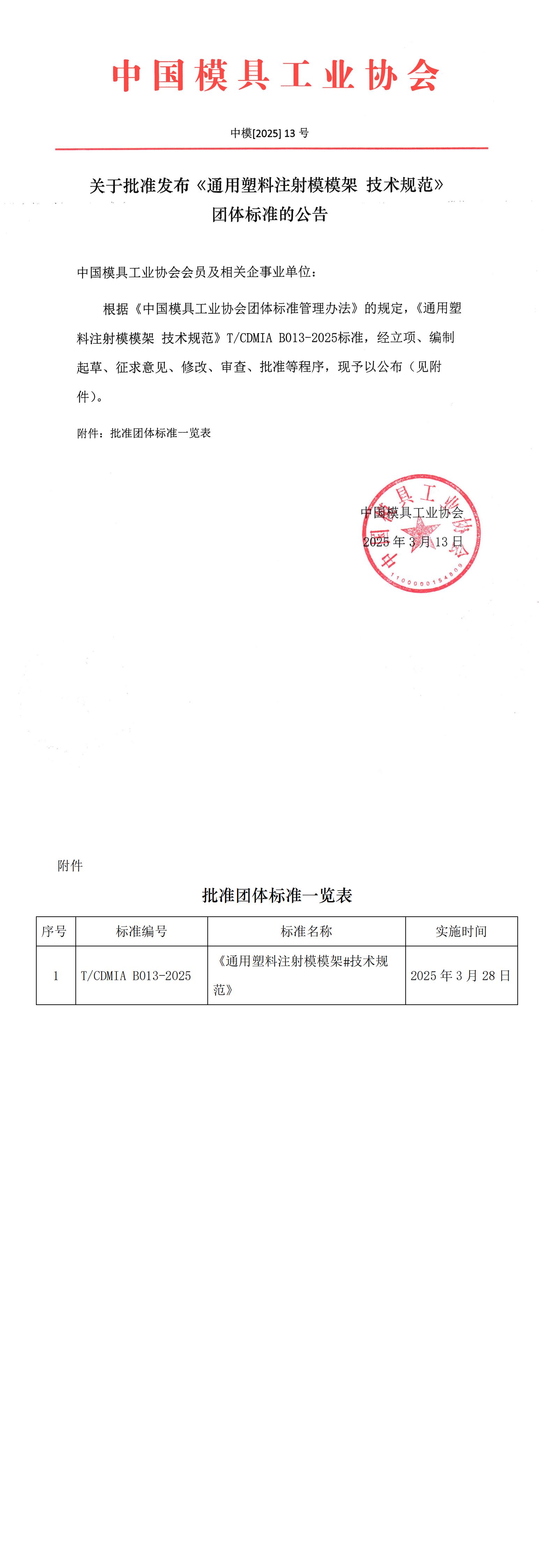 关于批准发布《通用塑料注射模模架 技术规范》团体标准的公告